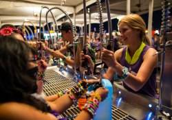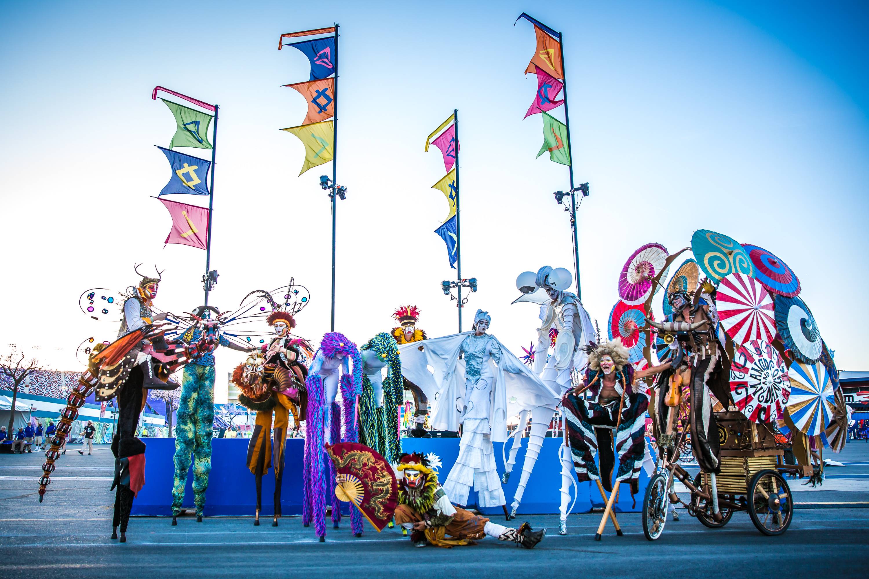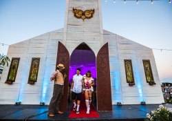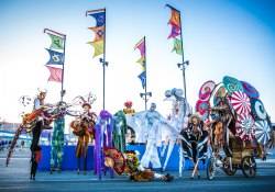 Adventurous festival goers discovered twenty new and returning interactive art installations dispersed throughout the Speedway, including a playground of new art pieces in the Art Garden. Inspired by the Hagia Sofia in Istanbul, Turkey, the Palace Blue stood as a massive architectural environment in the grassy field of EDC. Created primarily out of bamboo, the breathtaking structure was supported by graceful steel arches topped with colorful fabrics in shades of blue and turquoise. Complete with a stage and aerial ring, festival goers could escape the heat beneath its shade and enjoy performances from the famed EDC theatrical characters.