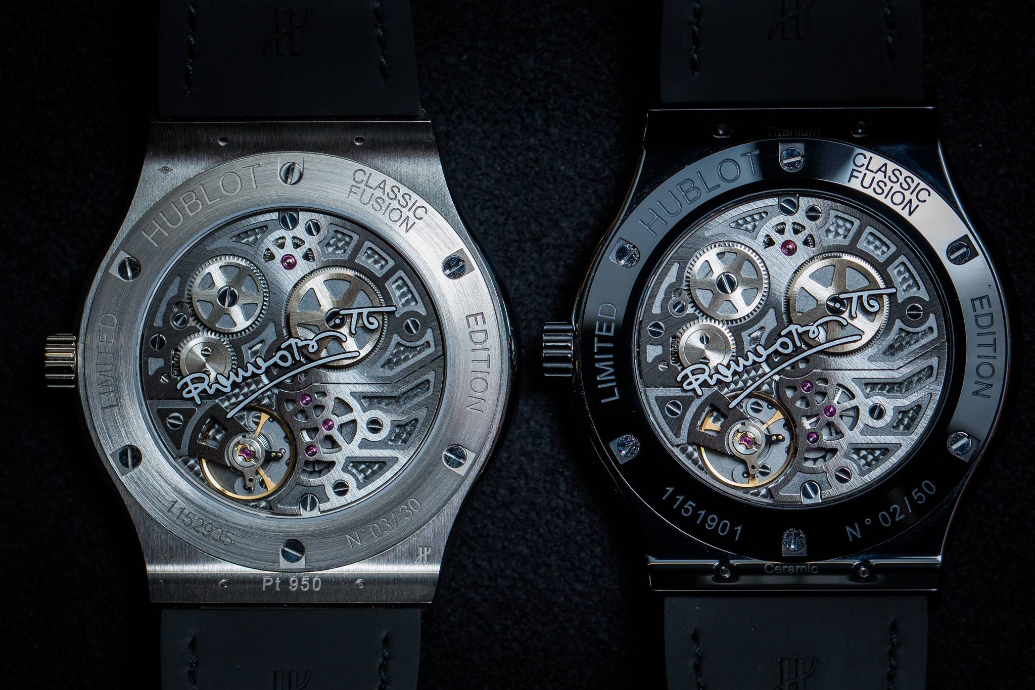 A sapphire crystal with interior/exterior anti-reflective coating reveals the in-house CLASSICO HUB1302 hand-wound movement. Depending on the version of the timepiece, it is enclosed in polished ceramic or circular-grained satin-finished platinum. The Hublot Classic Fusion Enamel Britto has a power reserve of approximately 90 hours and is water resistant to around 50 meters. Britto’s signature on the caseback gives it that extra special touch.