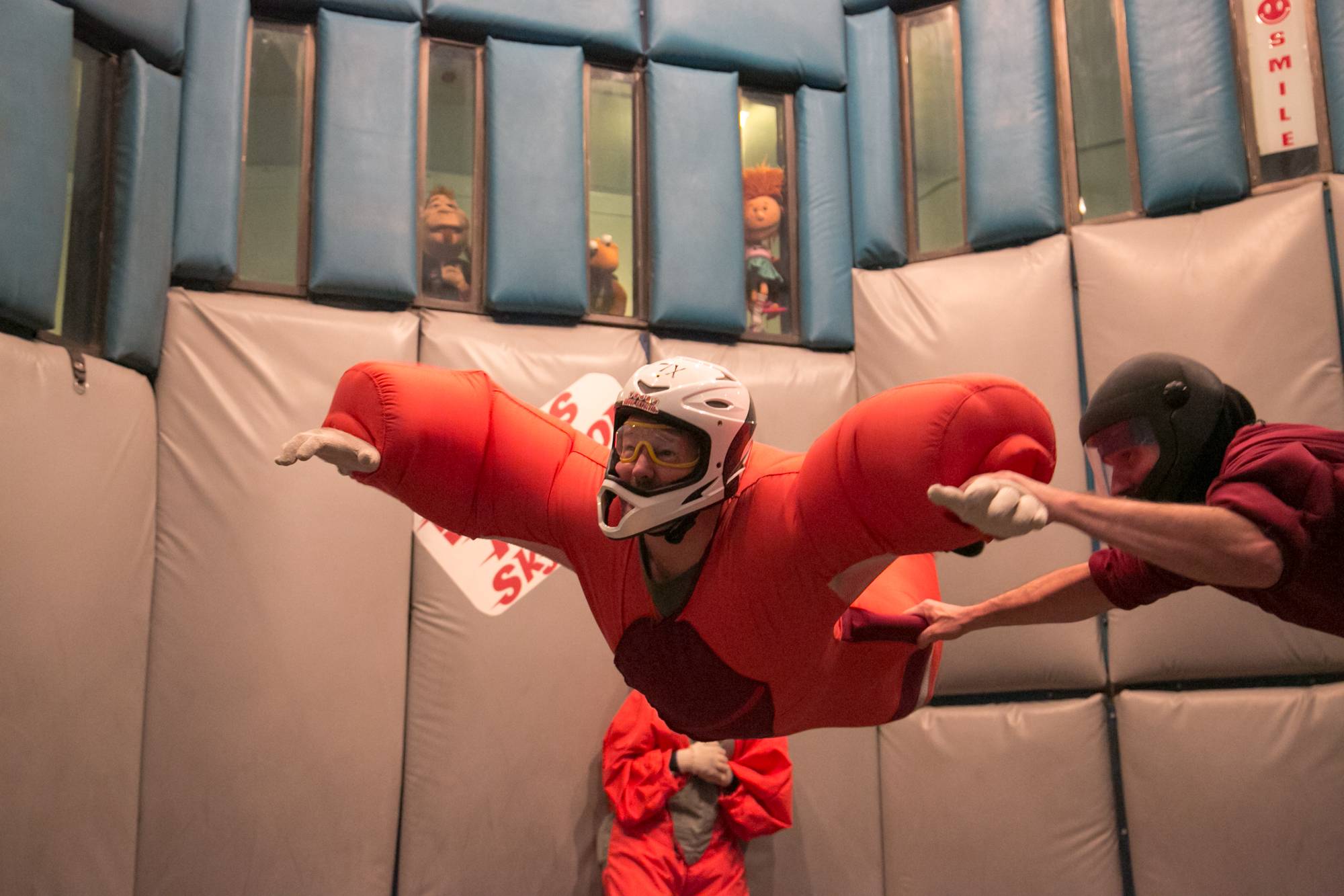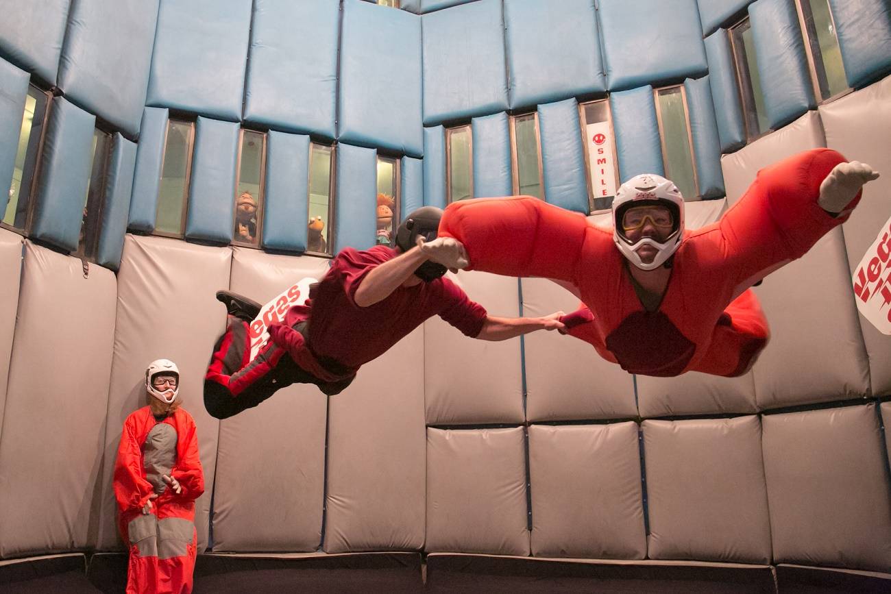Las Vegas headliner Terry Fator took a break from his show the Mirage on Sunday to hit Vegas Indoor Skydiving for some fun with cast members Taylor Makakoa, Ben Harris and friends in tow. During Terry’s session, some of his characters — Duggie, Winston and Emma — took in all the action from the observation deck, with Emma even getting close to the action with a selfie. The group spent an hour in the wind tunnel learning how to maneuver and fly at one of Las Vegas’ oldest attractions.