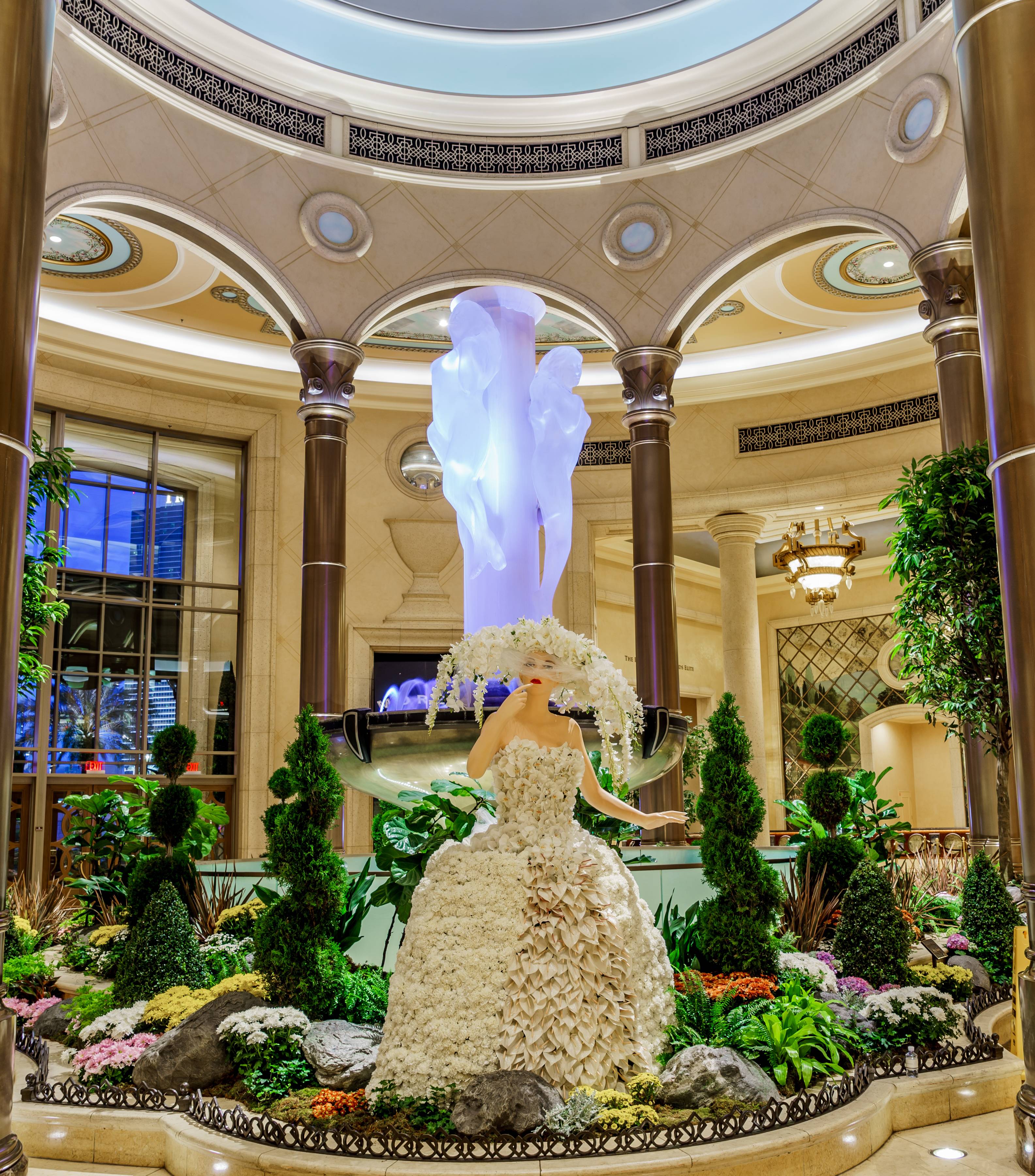 The new summer display inspired by Venice’s Carnivale di Venezia celebrations took two years for the floral and horticulture teams to create from inception to completion. Hundreds of hours went into design and art direction. The spectacular display was first constructed on a computer model which took three months to build. Venetian women topiaries that stand approximately nine feet tall are the focal point of the summer display.