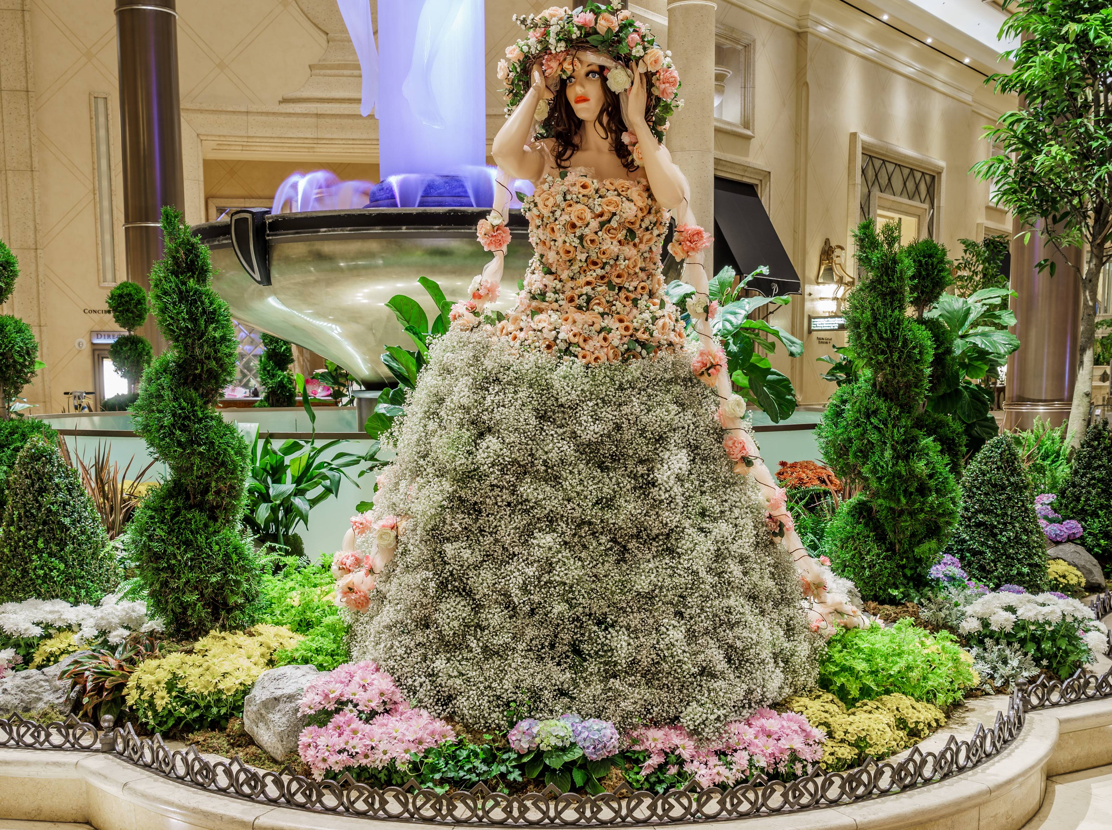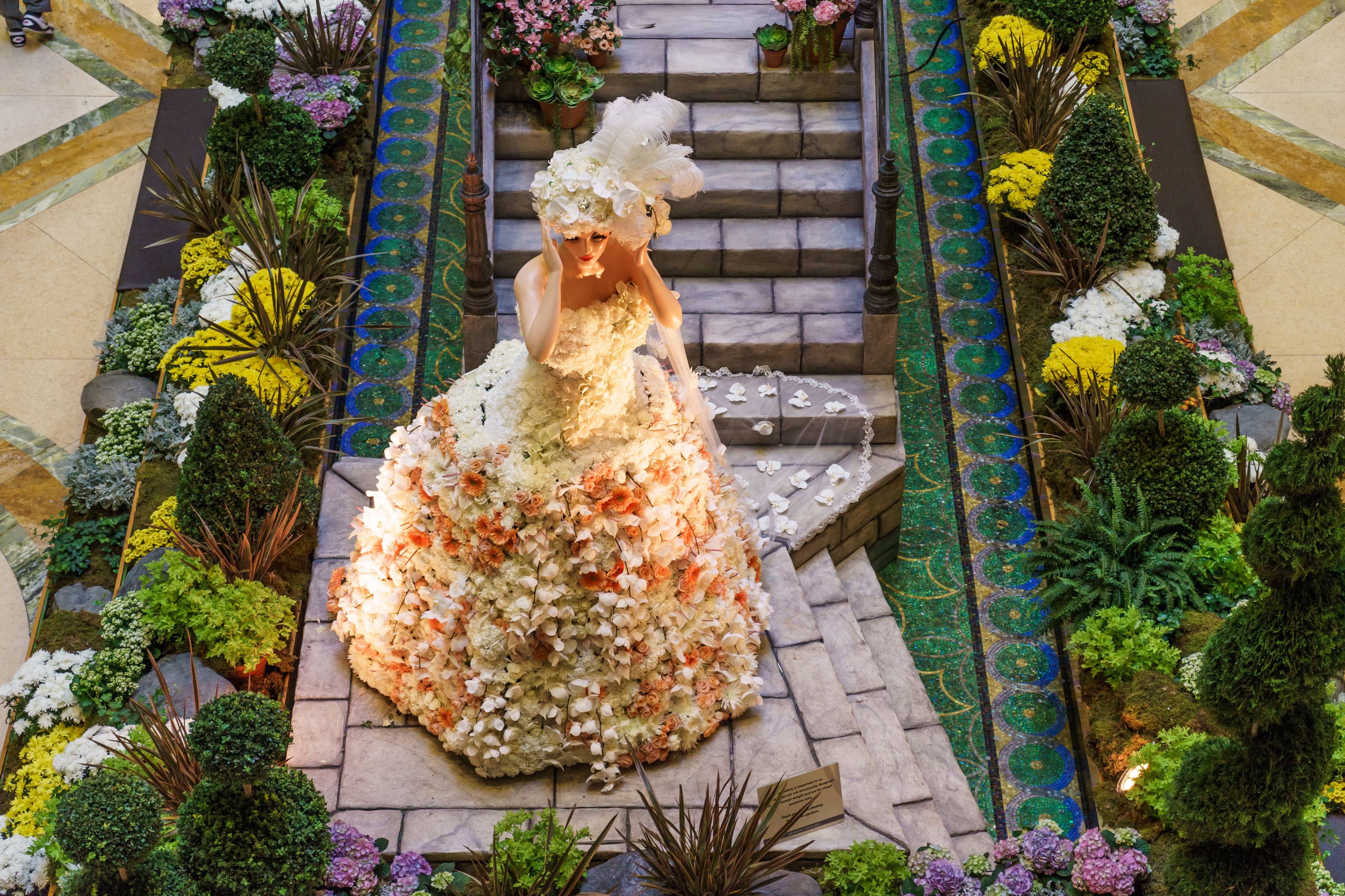 A team of 20 floral designers, gardeners, and engineers contributed more than 1,600 total hours toward the installation of the summer floral display. The topiary dresses are each constructed from approximately 2,500 flowers including roses, carnations, baby’s breath, Gerber daisies, phalaenopsis orchids, spider mums, and anthurium.