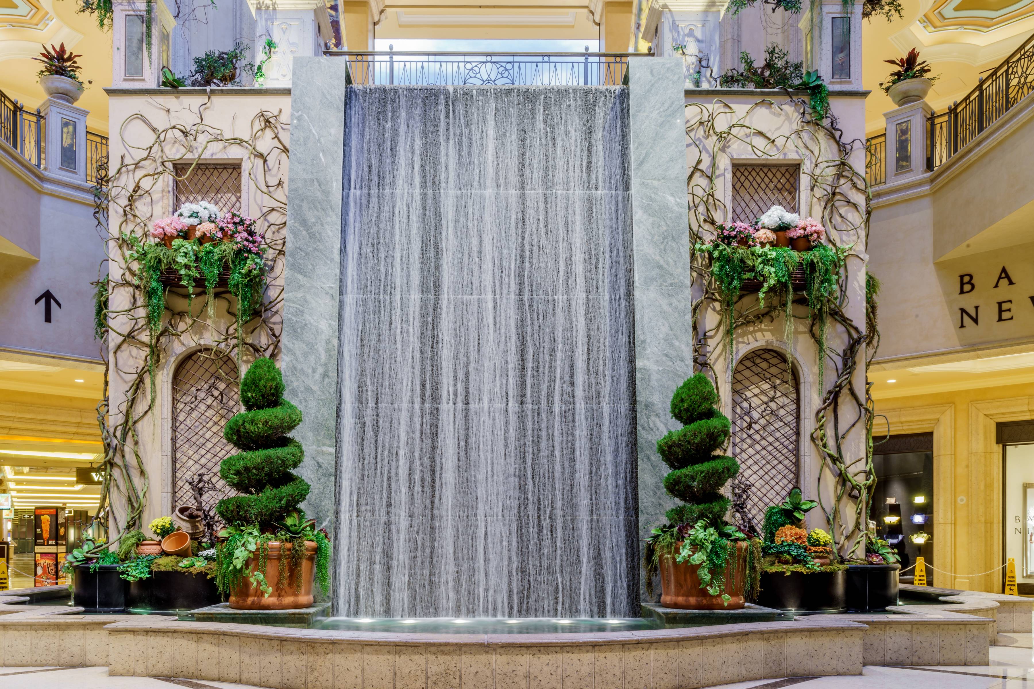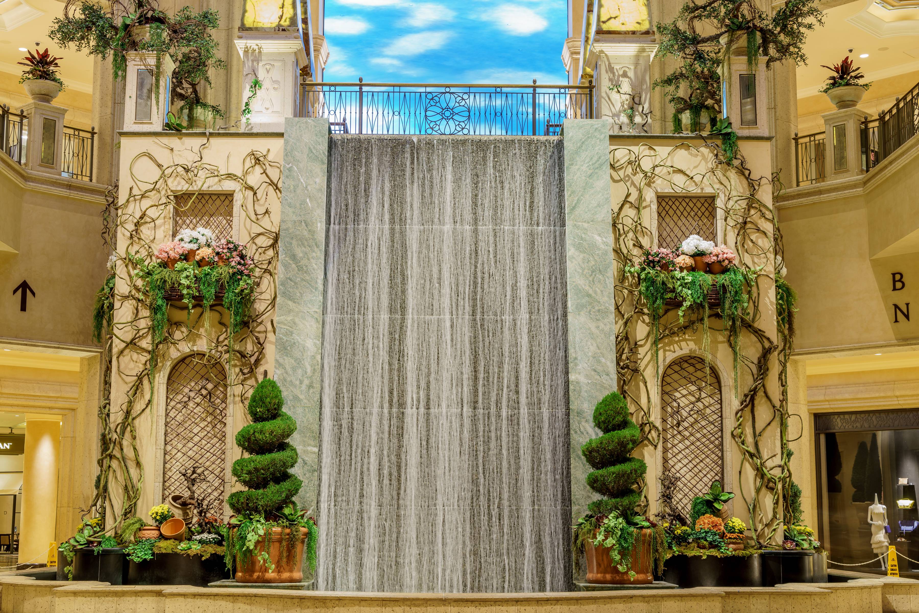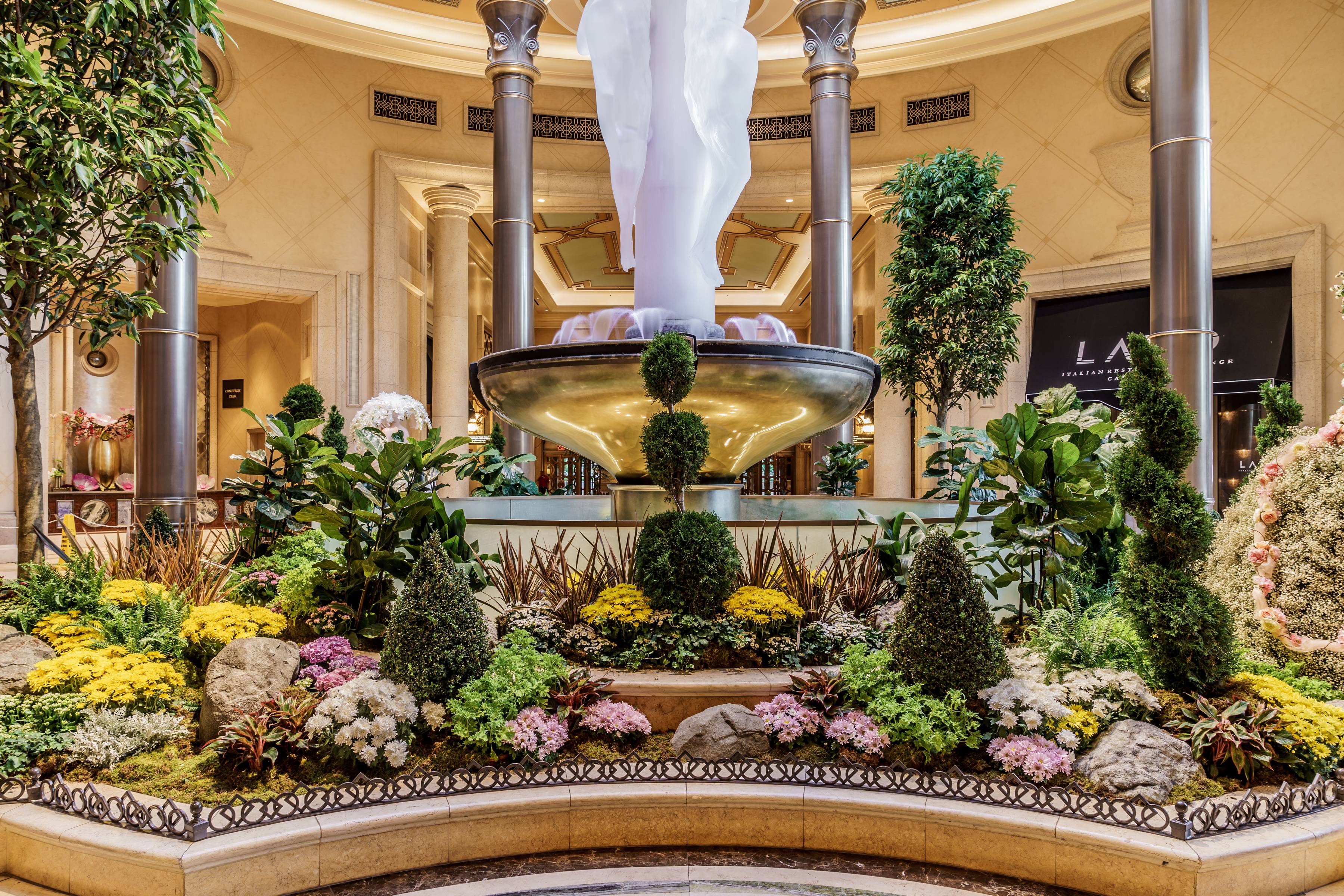The gardens are adorned with a variety of plans including hydrangeas, chrysanthemums, kalanchoes, fleurette mums, ivy, ferns, and various topiaries with different geometric forms to enhance the Venezia feel.