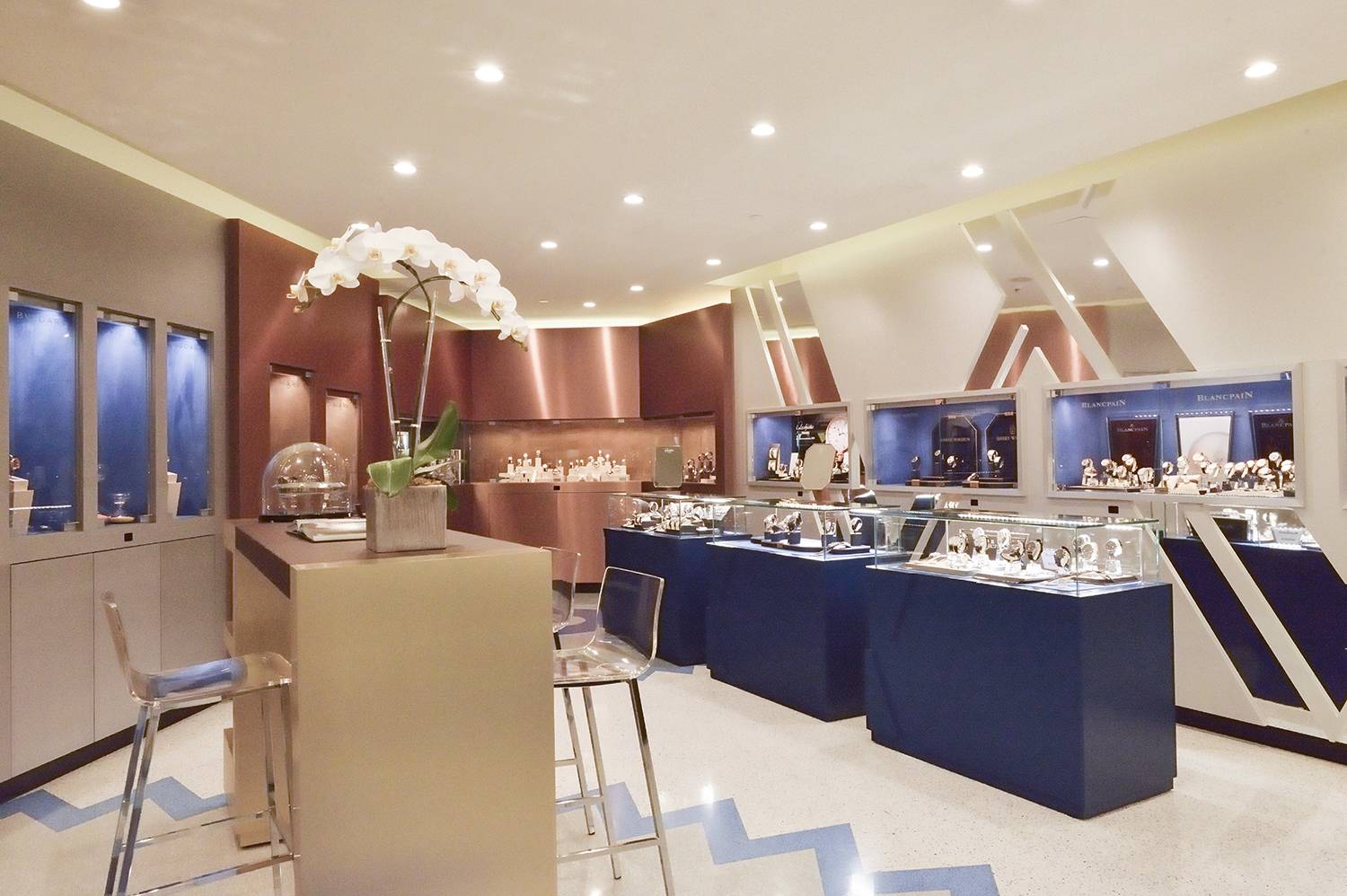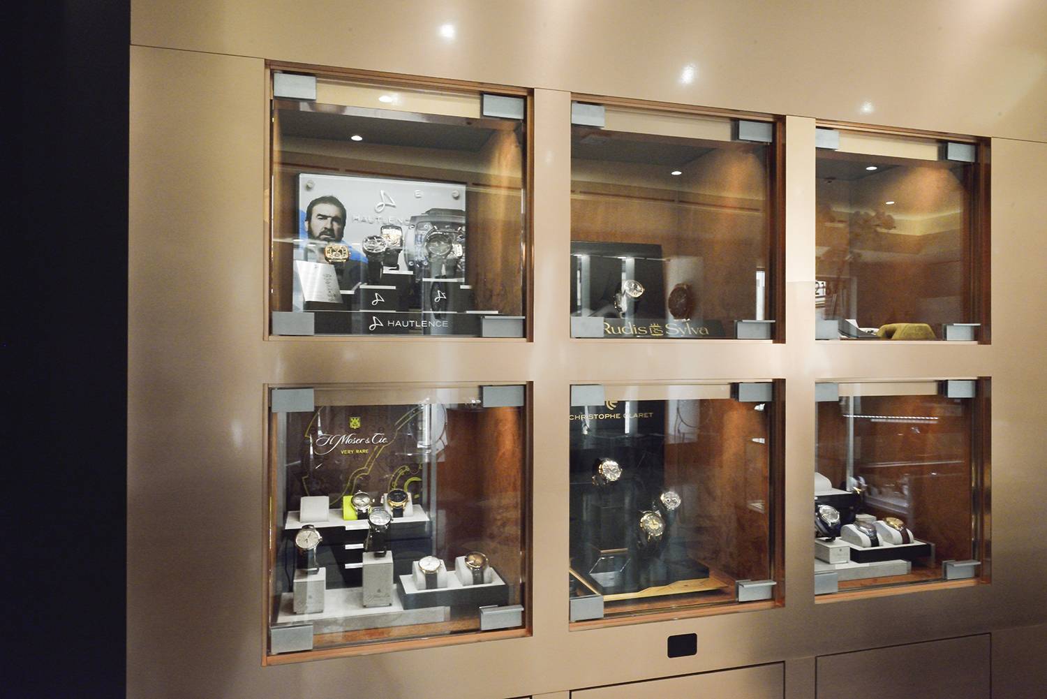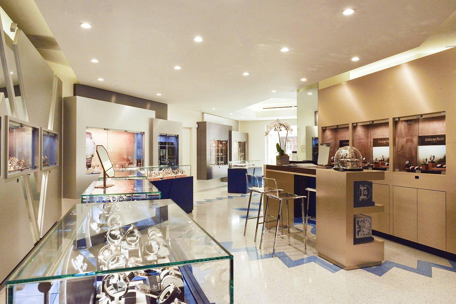 Within the boutique, showcases of varying shapes, sizes and colors are arranged in a series of intimate “neighborhoods,” allowing each of the 40 watch and jewelry brands on display its own unique setting.