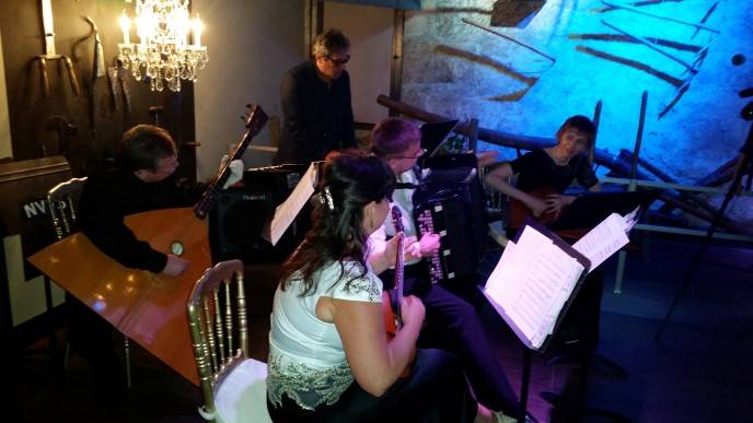 A long table with mannequins resembling historical figures, such as Mariano Vallejo and Haraszthy, known as the Father of California viticulture, amused visitors. In one corner, Style of Five, a unique Russian folk ensemble, provided entertainment. The musical group had just arrived the previous day from St. Petersburg to take part in the “Moscow Nights” concert at Castello di Amorosa on July 22. Style of Five’s exotic instruments, with names such as domra, gusli and double bass balalaika, were as eye-catching as the historical mannequins.