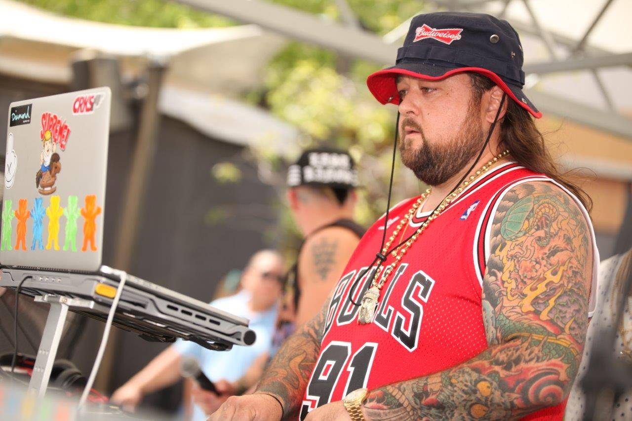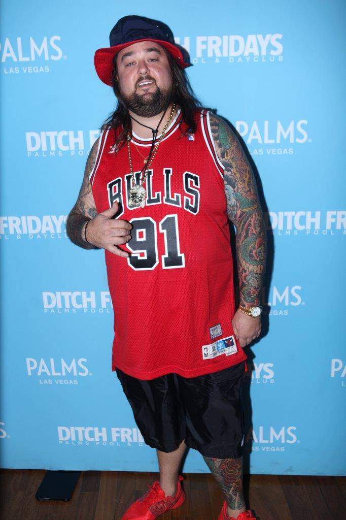 Chumlee wore a vintage Dennis Rodman Chicago Bulls jersey, a Budweiser beach hat and Nike sneakers for his second deejay gig of the year at the Palms.