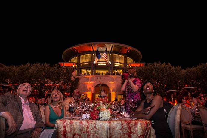 The highlight of every Napa Valley Festival del Sole is the Annual Festival Gala at Meadowood Napa Valley, and despite scorching temperatures, this was indeed another grand event. The evening got underway at 5 p.m. when 450 stylish guests, who included Nancy Pelosi, Paul Pelosi, Roger Barnett, Sloan Barnett and Jean-Charles Boisset, dressed in white descended on the grounds of the posh resort for a tented reception on the lawn that stretched 60 minutes. Then it was onto another tent, dripping in chandeliers with gorgeously-decorated tables, for the dinner and show. Darioush Khaledi, chairman of the Festival del Sole and proprietor of Darioush Winery, took the stage to welcome everyone. “It’s amazing how we started with six wineries, and now we have over 100,” he said, also adding the tremendous amount of Napa Valley businesses that lend support to this annual event.