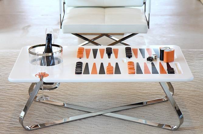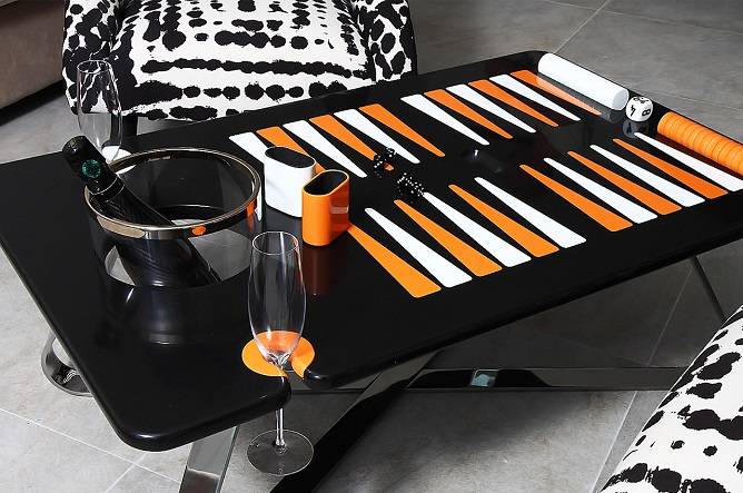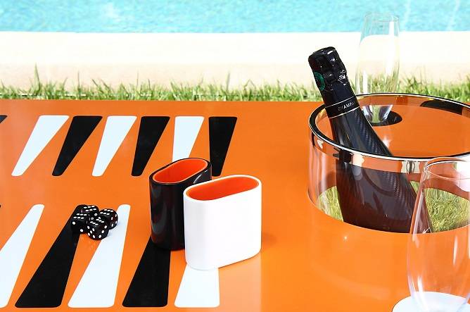 Whether you’re playing backgammon on a motor yacht or private jet or in a villa, you’ll never have to reach too far for a bottle of champagne with the new Deluxe Backgammon Set from The Orange Line. Individually numbered and handcrafted on the Cote d’Azur, this €14,900 euro [about $16,241] deluxe backgammon set is the first of its kind; it incorporates a champagne bucket holder and interchangeable champagne flute holders. As if that isn’t enough, this sleek gaming table also includes a Waterford crystal and platinum champagne bucket, a pair of champagne flutes and a bottle of Cuvée Carbon Champagne. This haute table is truly for the person who has nearly everything.