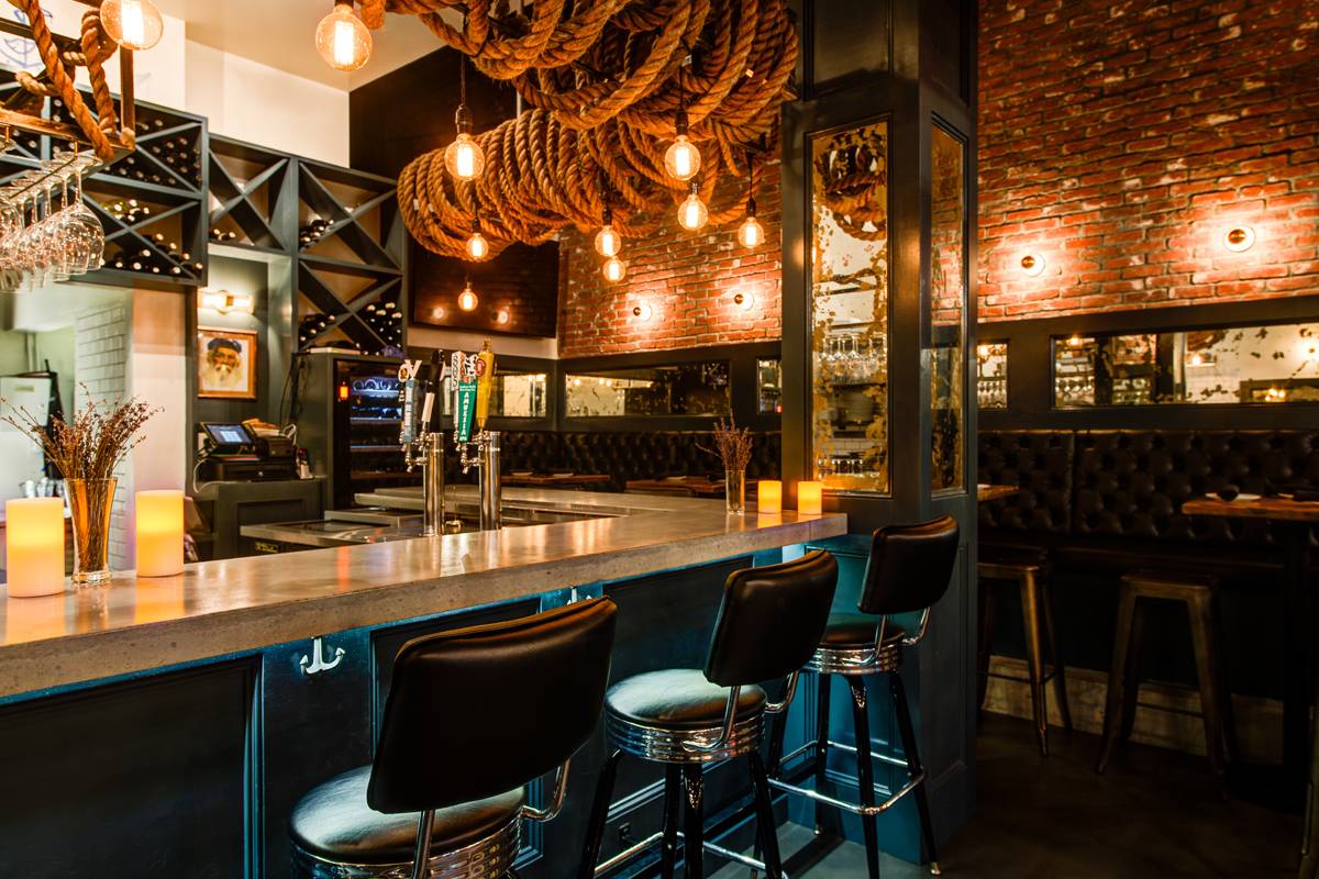 Walking in, you’ll find that this eatery—located just on the cusp of Santa Monica—has, as can be expected given its name, a nautical theme. You’ll find a dimly lit establishment with plush leather booths, wooden high tops and an open kitchen just by an L-shaped bar, above which hang a plethora of dock ropes and anchor lines.