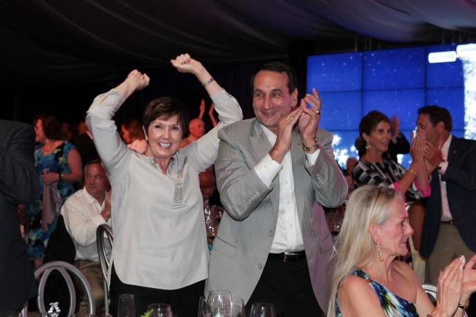 Krzyzewski and his wife of 46 years, Mickie Krzyzewski, hosted this year’s event. On stage at the gala, held under an elegantly-decorated tent, Krzyzewski showed why he could have easily been a comedian instead of a coach. He didn’t miss an opportunity to zing Bob Lloyd, Board Chair Emeritus of The V Foundation, a current board member and Valvano’s former college roommate at Rutgers University, or sons-in-law. Coach K, as he is known as, also wants to change the name of the V Wine Celebration to the Winning Celebration.