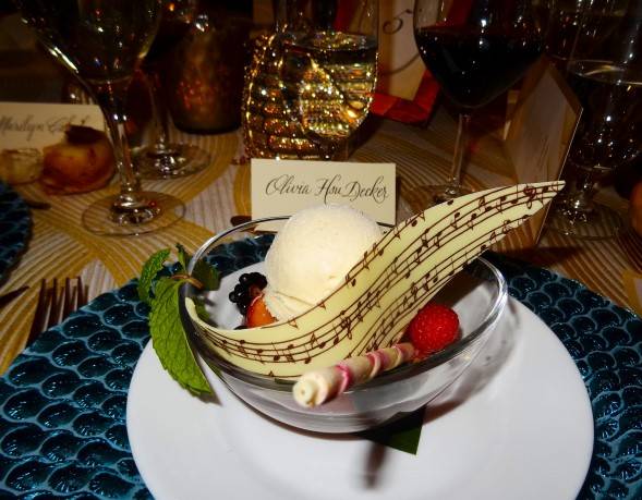 Dagmar Dolby and her daughter-in-law Natasha Dolby chaired the opening gala, which began with cocktail receptions. Inside a tent on Grove Street, the 730 guests at the Patrons’ Dinner feasted on Maine lobster paired with Iron Horse Vineyards, 2013 Estate Chardonnay, herbed lamb chop and lamb shoulder rillettes and seasonal vegetables paired with Iron Horse Vineyards, 2012 Estate Pinot Noir, and a roasted peach melba dessert with a sweet ribbon of sheet music and vanilla ice cream.