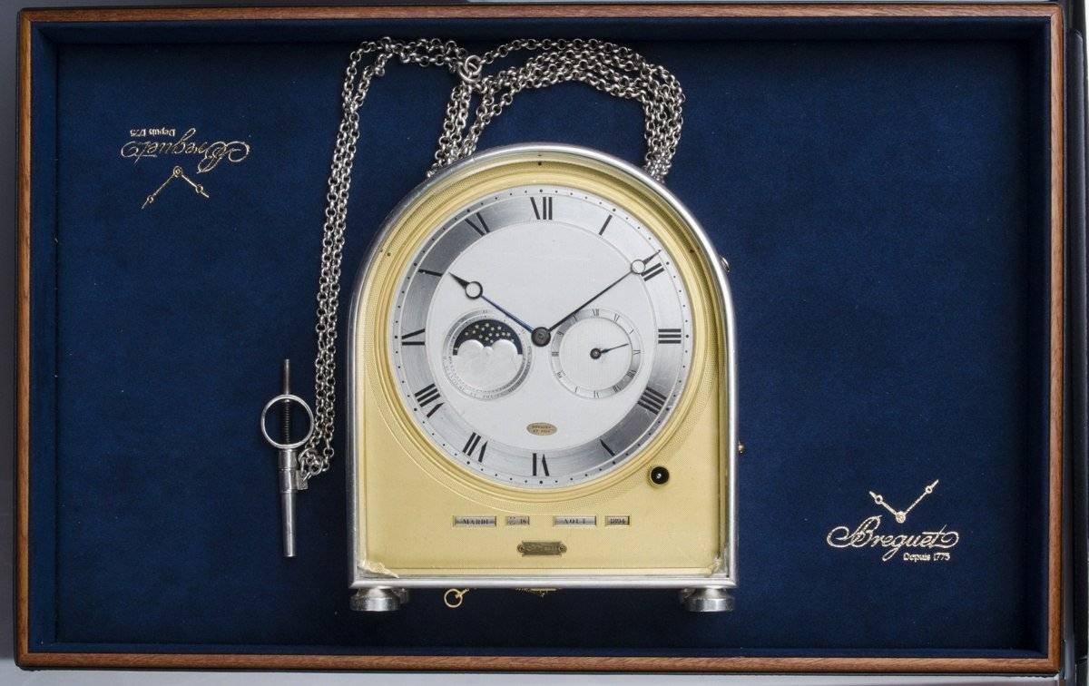 Referred to as a “carriage clock”, it features a half-quarter repeater, alarm function, phases and age of the moon, complete calendar with day, date, month and year apertures, silver milestone-shaped case, engine-turned silver dial.