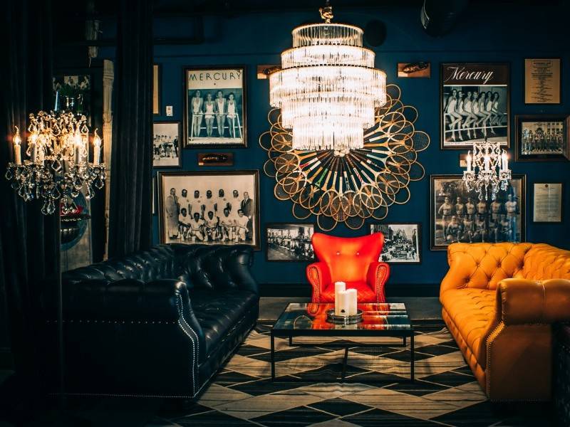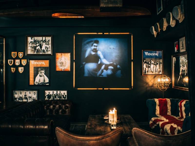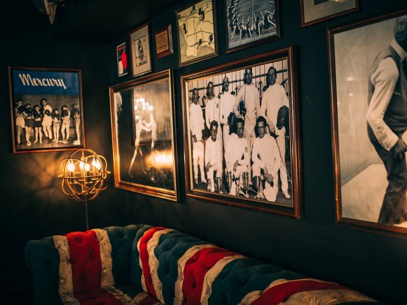 Vintage curiosities appear everywhere, from the violin medley above the huge Drum bookcase to rows of artfully arranged hockey sticks and shin pads. The team scoured the building for memorabilia, from books and art to the trophies that sit proudly on the American Lockers, which act as liquor lockers for The Macallan’s “by the bottle” list, so members can dip into their favorite single malt at leisure. Timothy Oulton’s signature Pillar of Knowledge – a floor to ceiling tower of books – is planted with a dozen books written by original members of the LAAC’s Uplifters Club.
