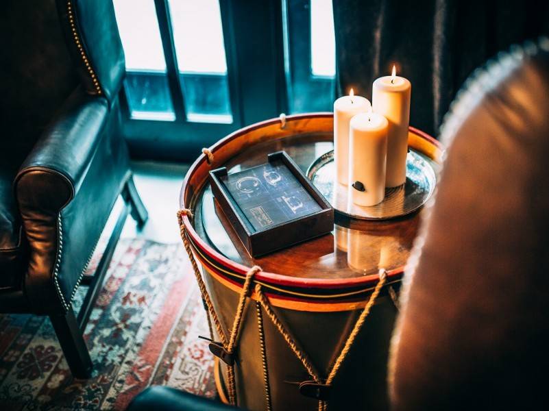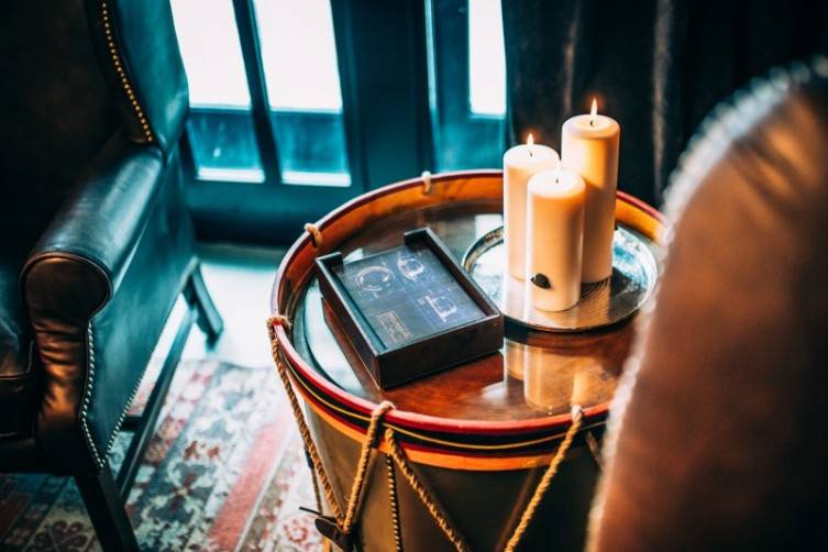 A quiet nook by the window exudes the air of a classic gentlemen’s lounge. Seated around brass Drum side tables, inspired by 19th century British military drums, oversized leather wingchairs offer decadent comfort under the mellow glow of more Crystal chandeliers. A crate of vintage playing cards suggests a long evening ahead, perhaps a few games of blackjack over whisky. timothyoulton.com