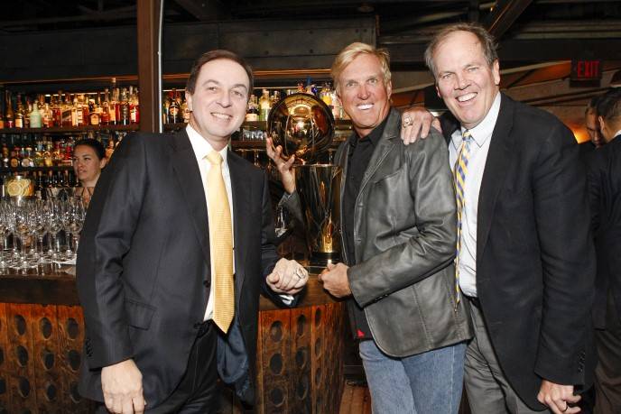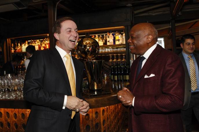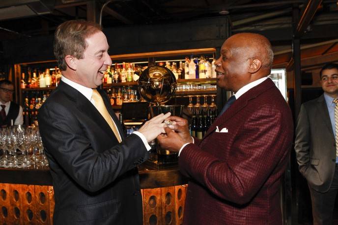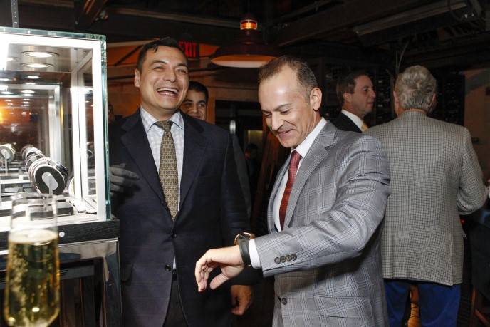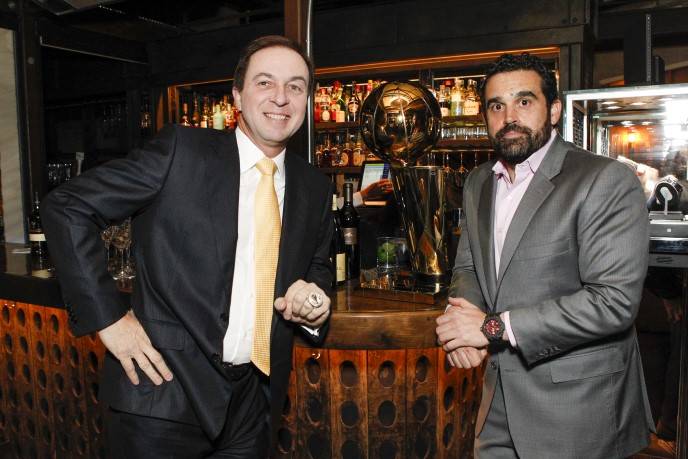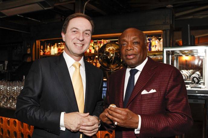 During the reception, Zacapa Rum cocktails were served and attendees enjoyed seeing the NBA trophy up close and trying on various Hublot watches, including the haute $414,000 MP-05 LaFerrari Gold, one of only 20 in the world. The expensive timepieces weren’t the only things being tried on. Lacob, Curran, and Craig Johnson, a member of the Warriors’ executive board, sported their championship rings, which guests got a kick out of checking out as well. Brown tried on Lacob’s championship ring and, when he returned it, pretended to exchange wedding vows with the Warriors owner, saying “with this ring, I thee,” as he slipped the bauble back onto Lacob’s finger.