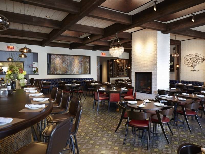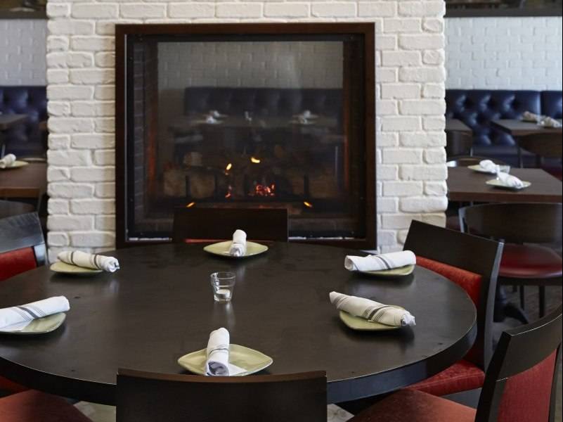 When you peak inside, you’ll find an upscale-casual eatery with standout features such as a wood-burning hearth oven, a glassed-in kitchen as well as a floor-to-ceiling dual-sided fireplace. It is modern and rustic at the same time, with inviting, midnight blue booths, brightly-tiled floors, wooden tables and a white brick ceiling.