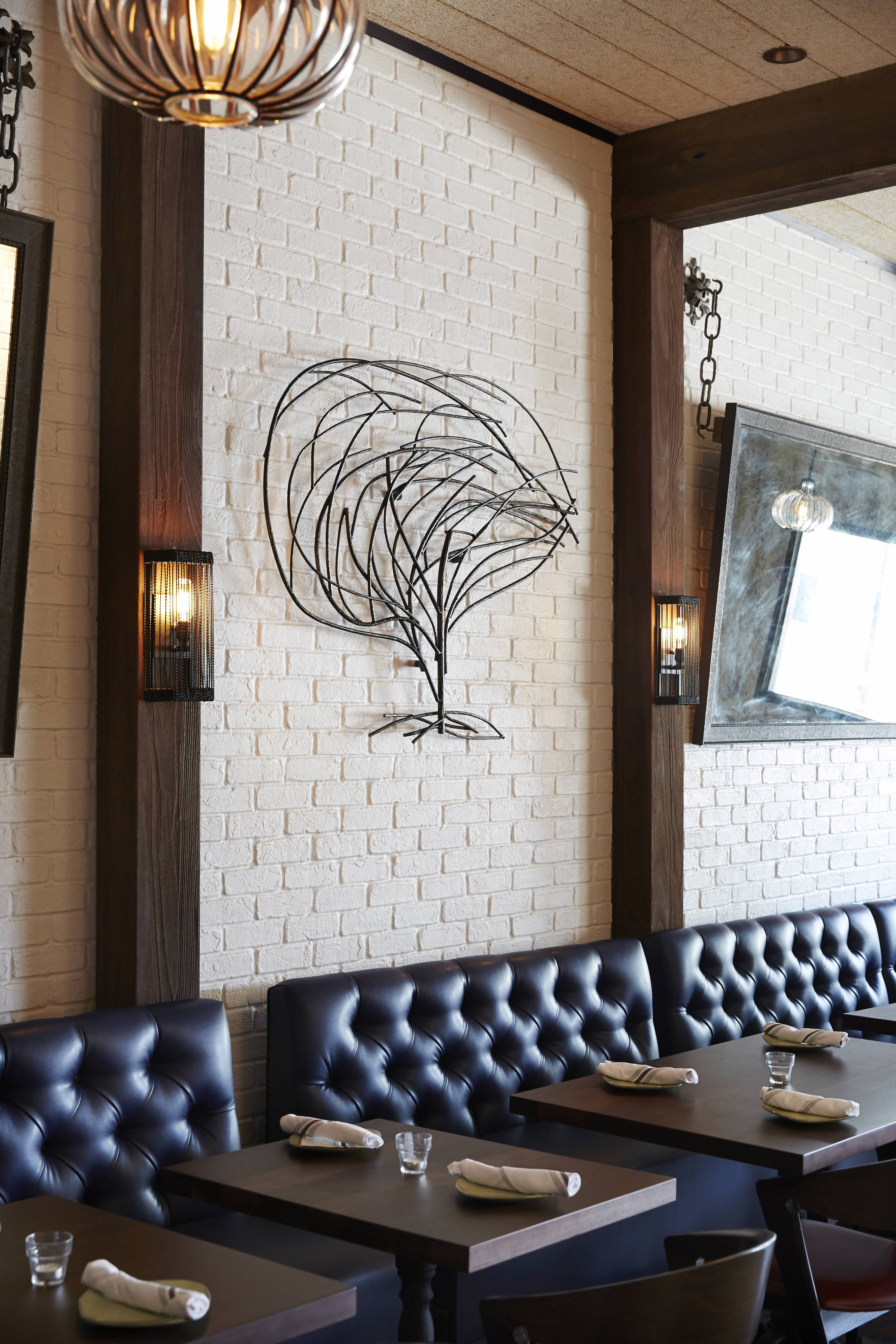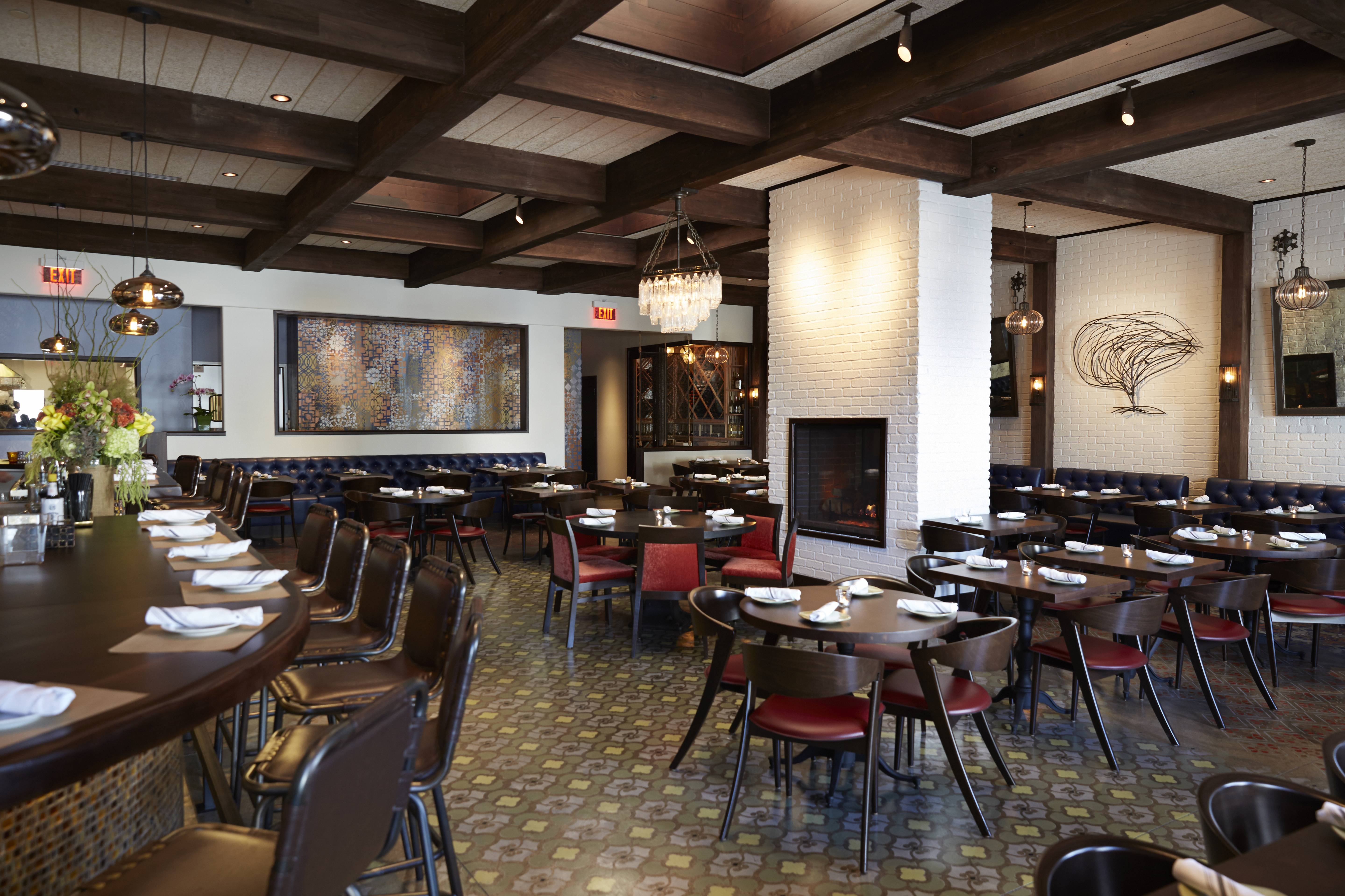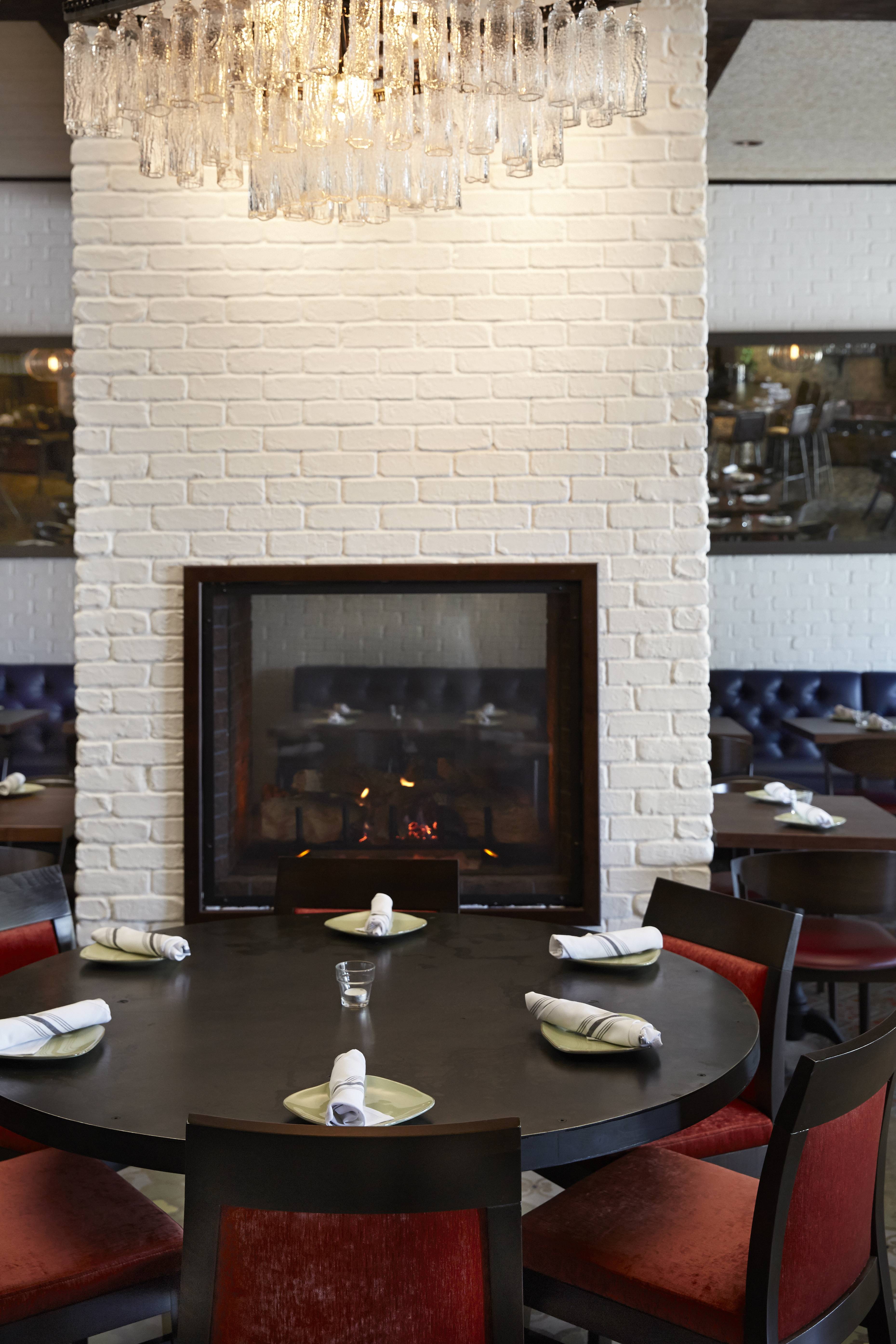 When you peak inside, you’ll find an upscale-casual eatery with standout features such as a wood-burning hearth oven, a glassed-in kitchen as well as a floor-to-ceiling dual-sided fireplace. It is modern and rustic at the same time, with inviting, midnight blue booths, brightly-tiled floors, wooden tables and a white brick ceiling.