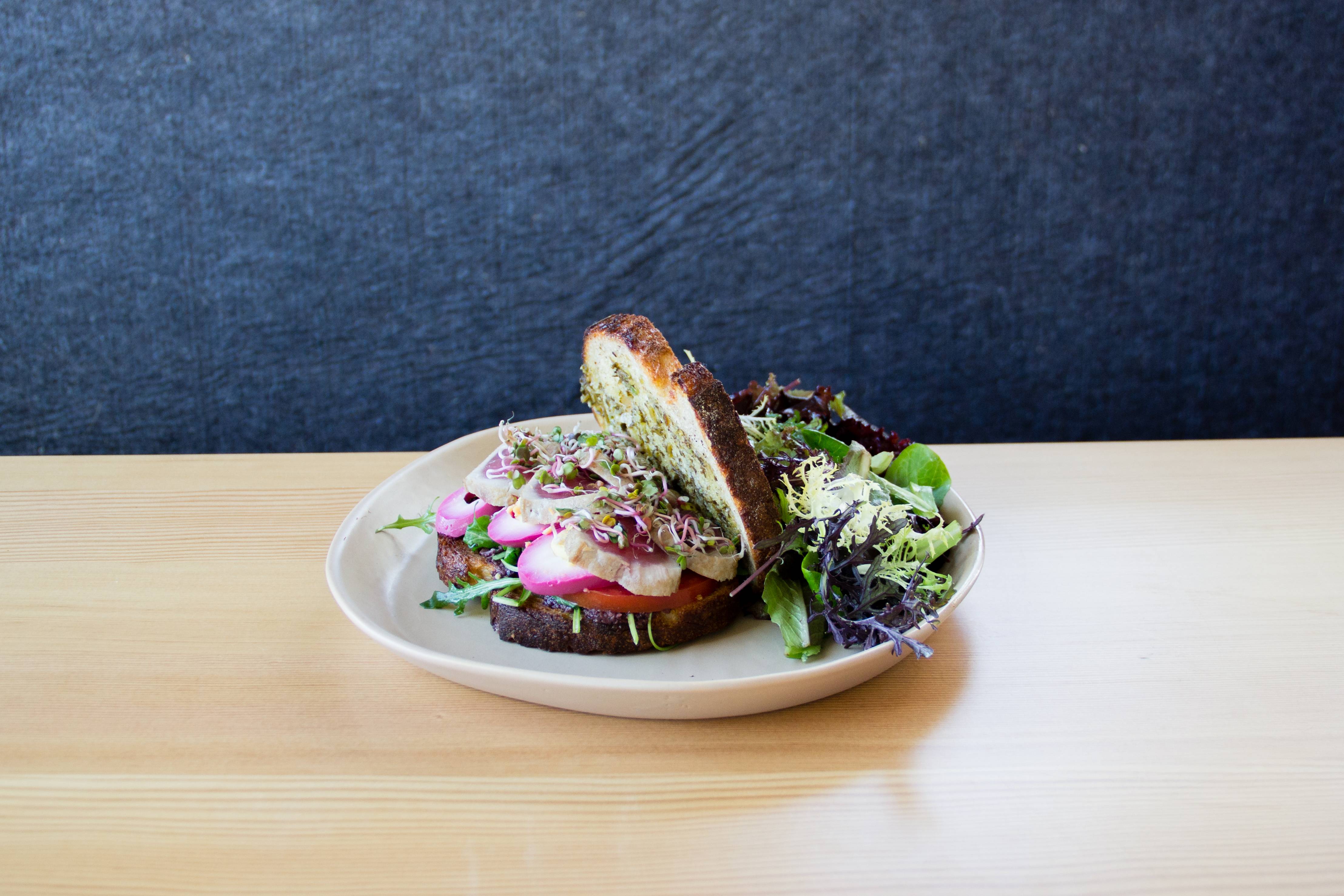- Oh, the bread. As it’s name implies, Superba Food + Bread is heavy on the bread, and that’s a great thing thanks to the golden touch of pastry director Carlos Enriquez. Housemade delicacies include croissant French toast (with golden syrup, creme fraiche and spiced walnuts—oh my), a breakfast sandwich with pain au lait served with a sunny side up egg, linguica and braised kale, and PB + J toast served with pistachio butter and blueberry-hibiscus jam. Noms indeed.