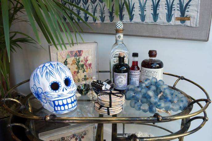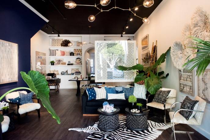 CB: When you walk in you’re sort of seeing the bar area [with] the bar cart. Our home often centers around entertaining so that’s part of why we put the bar up front. Then you’re in the family room and see some of our iconic textile pieces such as indigo, mud cloth and biddew noir. You move into the dining room. We only opened a little over a week ago. We’ve hosted three evening events including a dinner party around this table. The hearth will be transformed with an 8 ft. tall Christmas tree and stockings on the hearth. We really are trying to incorporate all of those different elements of the brand. We’re lucky to be in a really charming San Francisco building; but, also when we remodeled we tried to bring in those home elements. For example, we created these built-in bookshelves. We built this arch. We worked with a local interior design firm, Swaystudio, and they also put in this crown molding and these really beautiful custom light fixtures. We wanted chandeliers as the focal point for the dining table in the family room. And we have excessive greenery, which you have in a home.