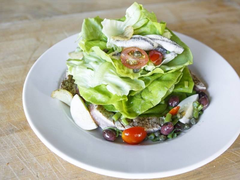 - BLD: Seared Tuna Niçoise Salad Fingerling potatoes, haricots verts, olives, spanish white anchovies, capers, hard boiled eggs, red wine dijon vinaigrette, $22