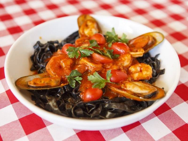 - La Pergoletta Restaurant Fettuccine Nero Di Seppia Al Frutti Di Mare Squid ink fettuccine, shrimp, scallops, mussels, calamari, clams, and tomato basil. $21.95