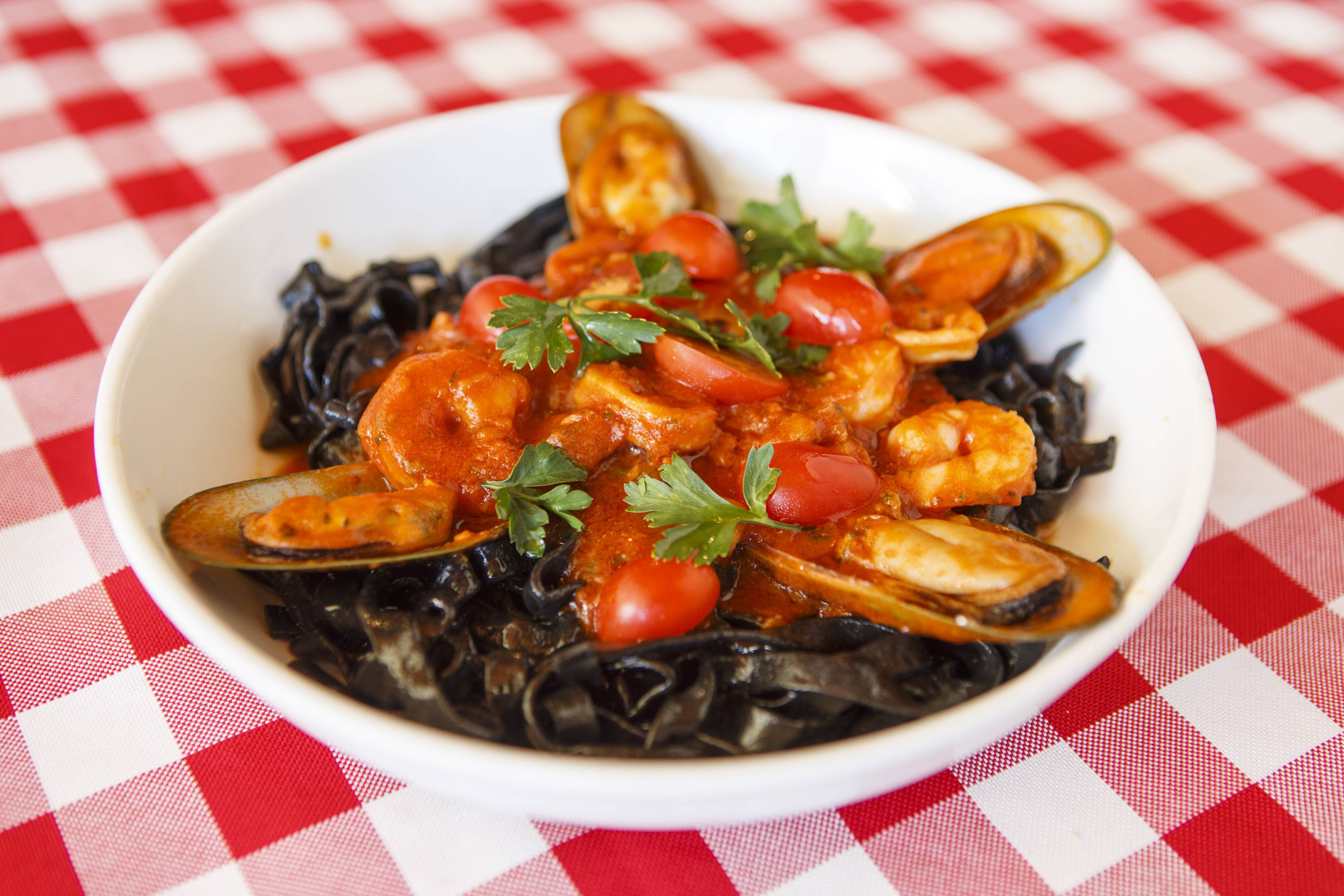 6. La Pergoletta Restaurant Fettuccine Nero Di Seppia Al Frutti Di Mare Squid ink fettuccine, shrimp, scallops, mussels, calamari, clams, and tomato basil. $21.95