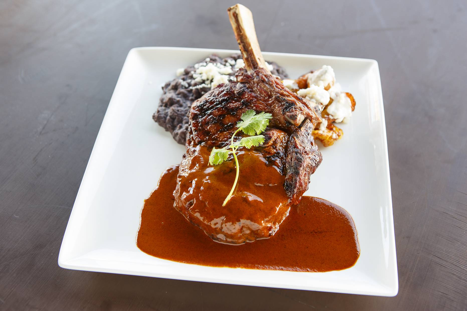 3. Red O: 18 oz Prime Cowboy Ribeye Prime bone-in ribeye, fried sweet plantain, crema, traditional black beans, and spicy adobo butter sauce. $49