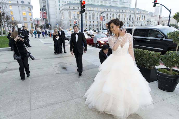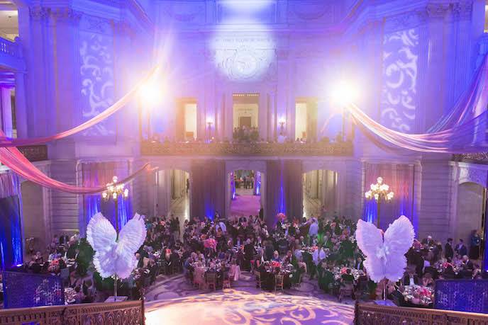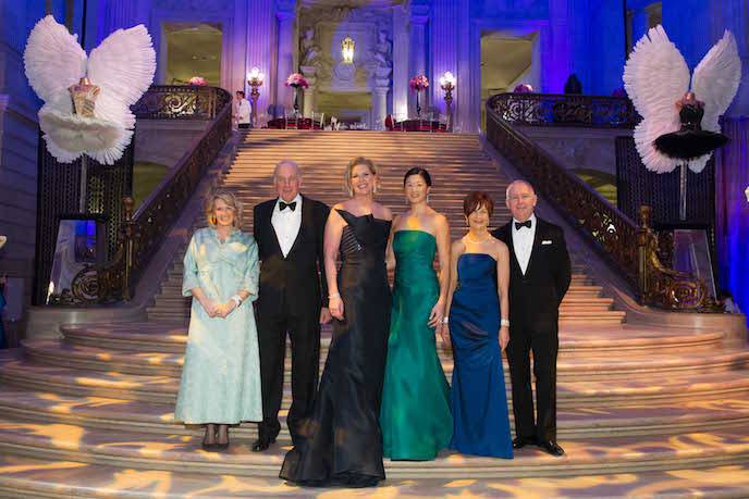 We’re pretty sure that Mrs. William S. Brandenburg, the gala chair, and SF Ballet Trustee Christine Leong Connors, the dinner chair, are still receiving congratulatory emails and phone calls for the splendid job they did. Barbro and Bernard Osher served as honorary chairs. The evening began with the city’s glitterati gathered in a sultry City Hall, creatively decorated by J. Riccardo Benavides of Ideas, for a Bulgari-sponsored reception in the South Light Court for guests of the SF Ballet Auxiliary’s Grand Benefactor, Benefactor and Patron fundraising dinners, which were deliciously prepared by McCalls to benefit SF Ballet’s annual fund. La Marca Prosecco flowed and Blue Angel Vodka cocktails were served as guests mingled about, posed for photos on the grand staircase and admired the décor. Benavides, inspired by Christian Dior’s 2016 couture fashion show and the SF Ballet dancers themselves, used everything from delicate onyx lace, to vivid fuchsia ostrich feathers. Yards and yards of peek-through sheer fabric were intermixed with lush, sensual velvet textures, including lace and interesting geometric patterns. Intermixed with the soft and fluid were structured, provocative objects. Little did the guests realize that these designs served a prelude to the combination of fluidity and structure that they would enjoy at the performance later in the evening.