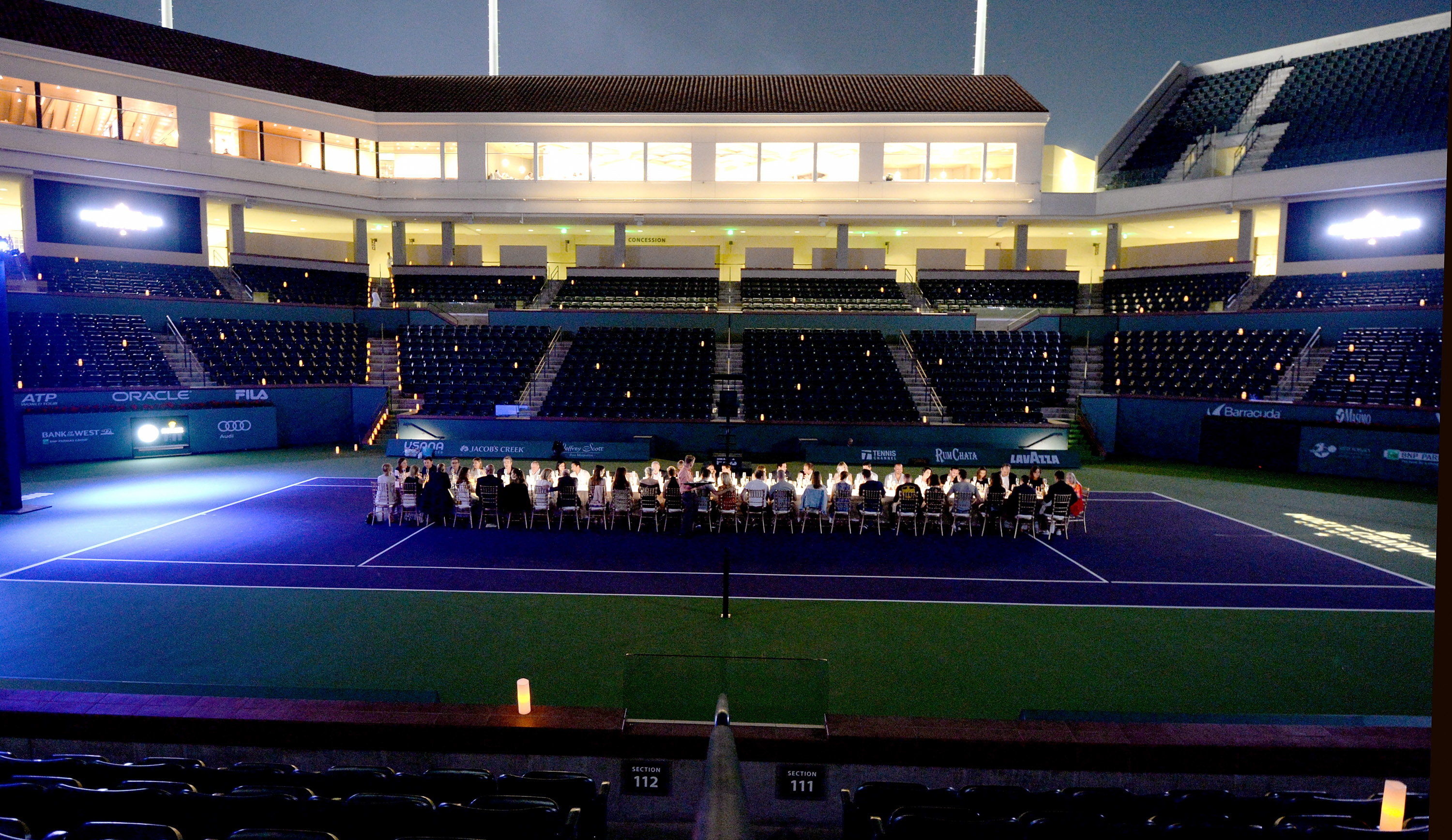 Just before the final match As Novak Djokovic and Milos Raonic prepared to square off for the tournament championship on Sunday morning (which world number one Djokovic won with a one-sided 6-2, 6-0 victory), an illustrious mix of stars and VIPs came together for the inaugural Moet & Chandon “Holding Court” dinner on center court of the Indian Wells Tennis Stadium. Each delectable course, designed by the world famous Nobu, was accompanied by a vintage Moët champagne.