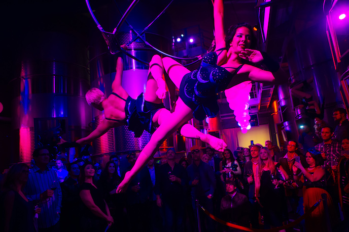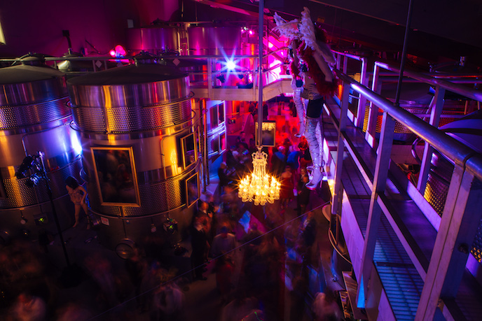 Anyone who think the Napa Valley isn’t fun at night hasn’t been to a party thrown by vintner Jean-Charles Boisset, whose over-the-top bashes are always loads of fun. Such was the case recently when the flamboyant Frenchman held at Raymond Vineyards its highly-anticipated, fifth annual Napa Gras, a Burlesque-themed celebration to inspire and delight the wine trade, journalists and VIPs in town to bid on the extraordinary wines for the Napa Valley Vintners’ Premiere Napa Valley. Boisset greeted attendees with JCB No. 21 sparkling wine while seated in a larger-than-life coupe Champagne glass. This year’s theme was burlesque and attendees came dressed to impress in unique masks and custom-made attire. Raymond Vineyards’ wines were served throughout the night and entertainment was the highlight of the evening with special performances by Brook Lynn’s Burlesque, aerialists and gold body-painted models from Aurora Circus Arts-Aerial Entertainment, entertained party-goers throughout the evening by performing on the main stage in the Crystal Cellar tasting room. DJ Jeff from Wine Country Entertainment was on hand playing music throughout the winery, while live music from Honey Mahogany serenaded guests in the famous Red Room.