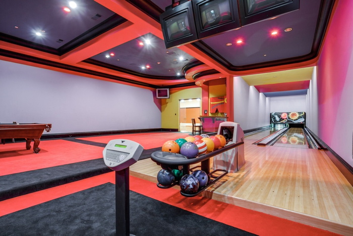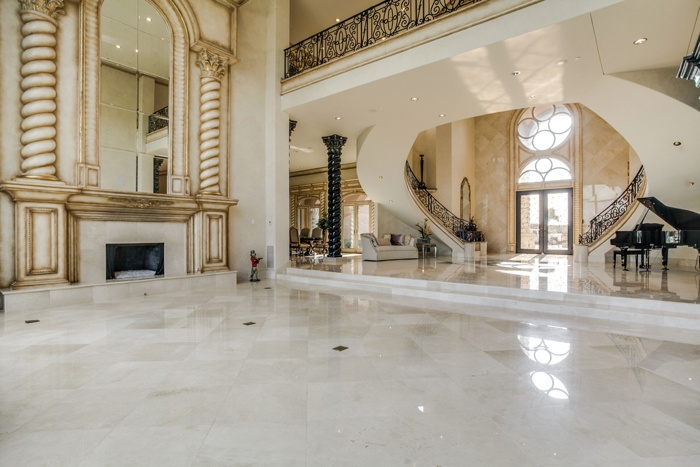 This architectural masterpiece situated on nearly 6 acres thrills the senses from the moment you drive up. Upon entering the grand foyer that sets the focal point of the sprawling estate, you are greeted by a breathtaking, floating double staircase. With beautiful marble floors throughout the home, wall to floor windows and meticulous attention to detail the craftsmanship of this home is beautifully displayed in each room. The entertainment wing makes this home ideal for entertaining your guests and includes a home theater with a stage, two-lane computerized bowling alley, arcade room, indoor basketball court, sauna, barbershop, steam showers, and more.
