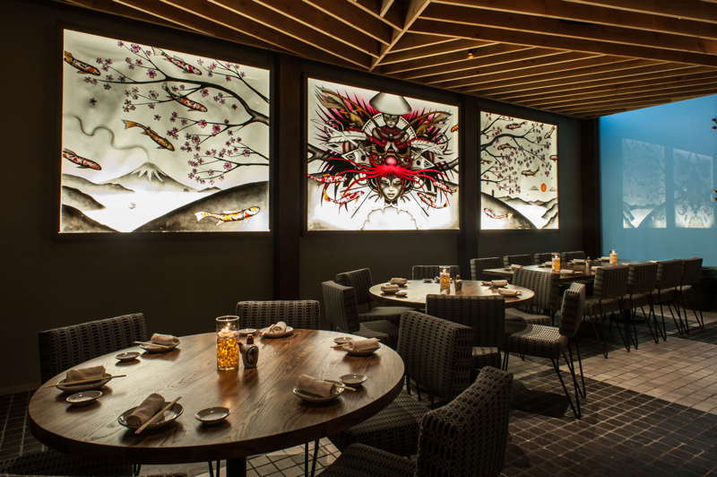 A major focal point of the restaurant is the feature wall showcasing Asian-inspired street art. Created by artist Hans Haveron especially for Roku Sunset, the large three-paneled piece, which spans 20 feet, is a collage of figures and landscape. The glass panels are backlit for a soft glow.