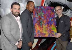 Paul Gerben presents Anthony Mackie with the Captain America painting he created in his honor