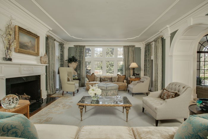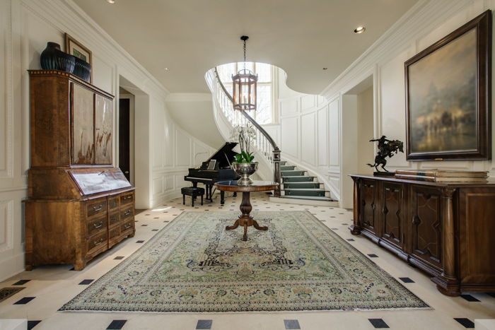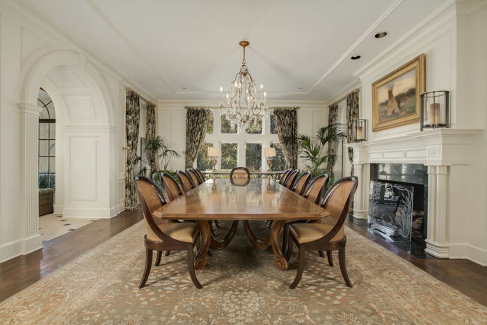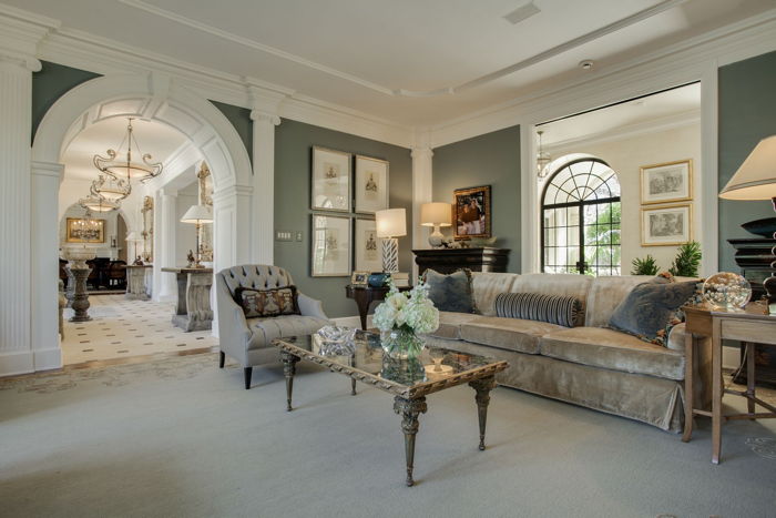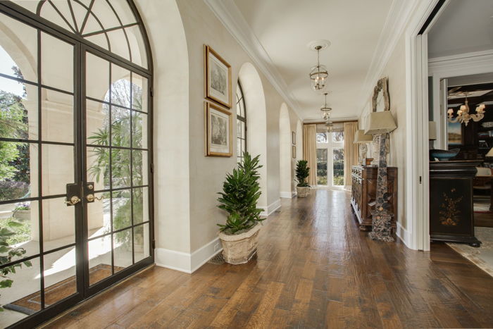 This stunning hallway framed by ceiling to floor windows and glass doors lets the outside light pour in casting a soft and romantic glow. Through the many columned alcoves the rooms open up to a sumptuous rooms including a formal dining and sitting room.