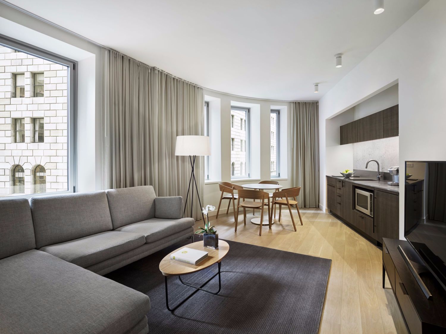 The 17-story building housing AKA Wall Street features a pre-war façade made of rusticated white marble, terra cotta, and brick in the style of classic English Baroque architecture. There are 132 roomy units, which include studio, one-bedroom, two-bedroom, and penthouse suites, ranging in size from 362 square feet to 1,103 square-feet.