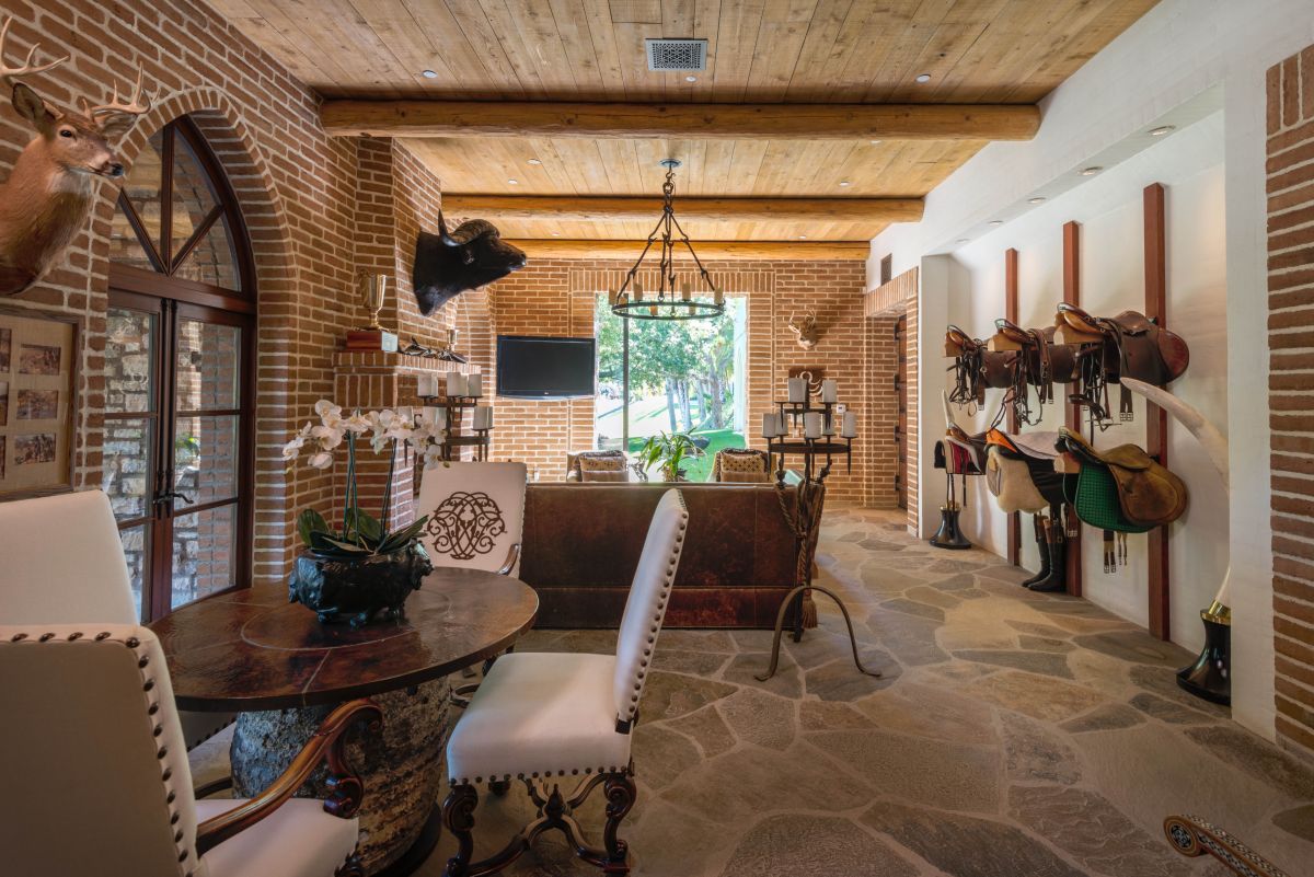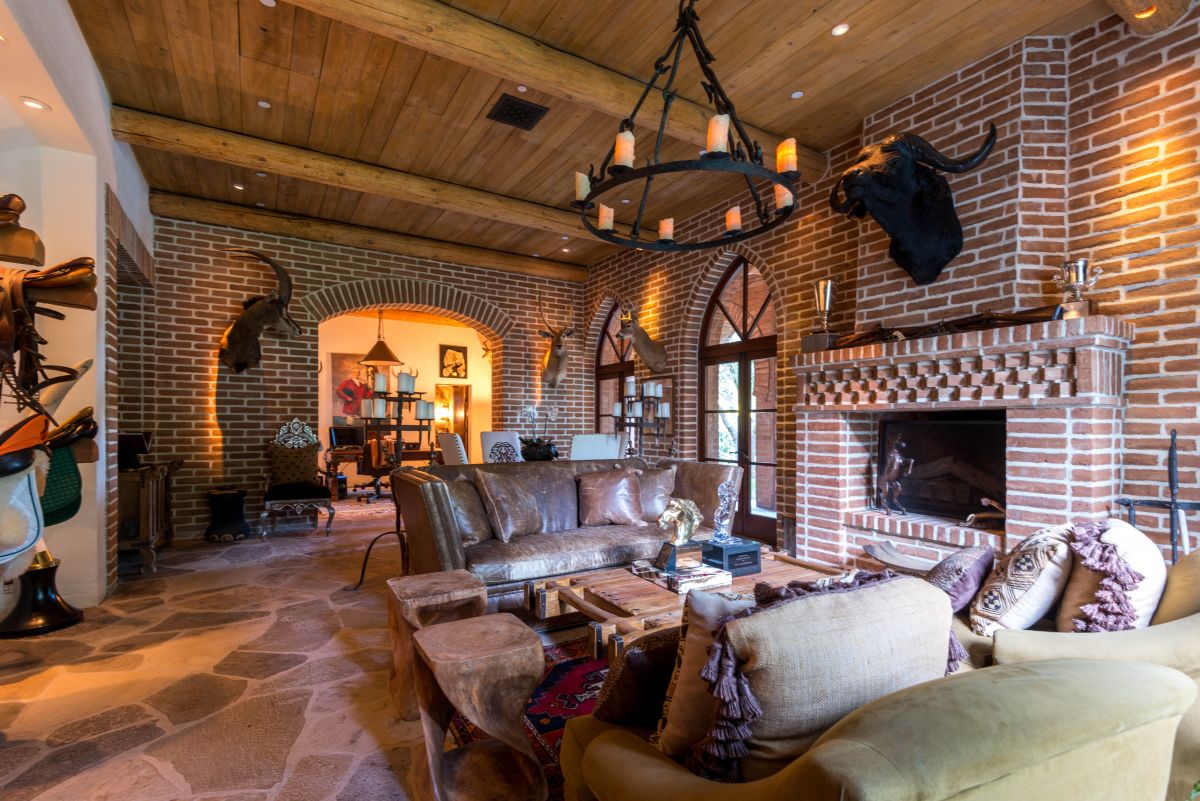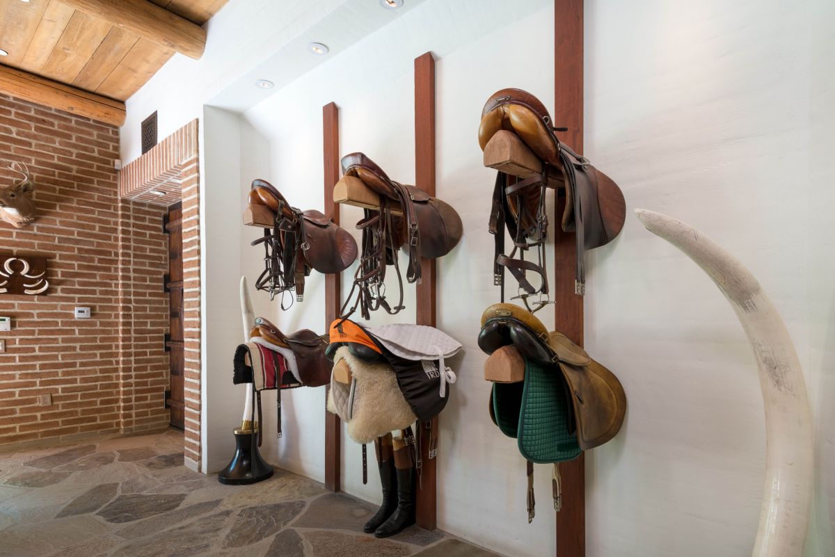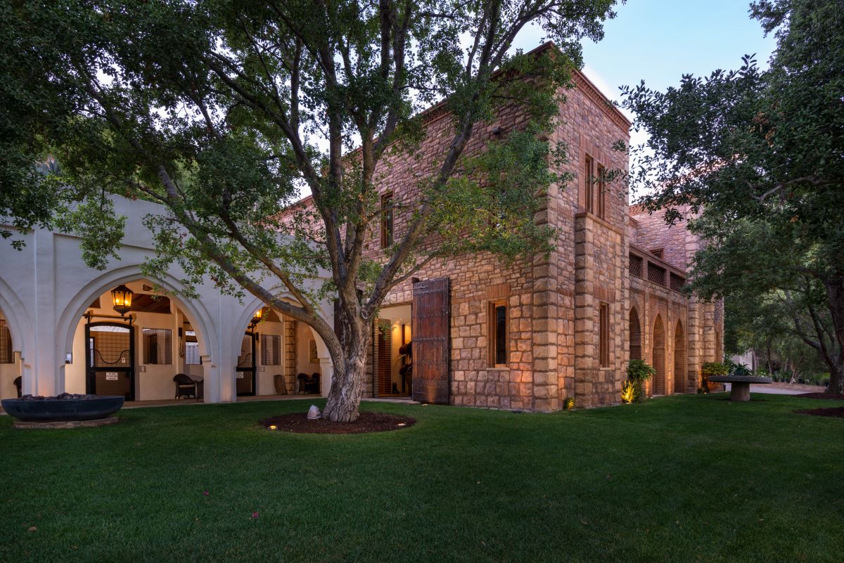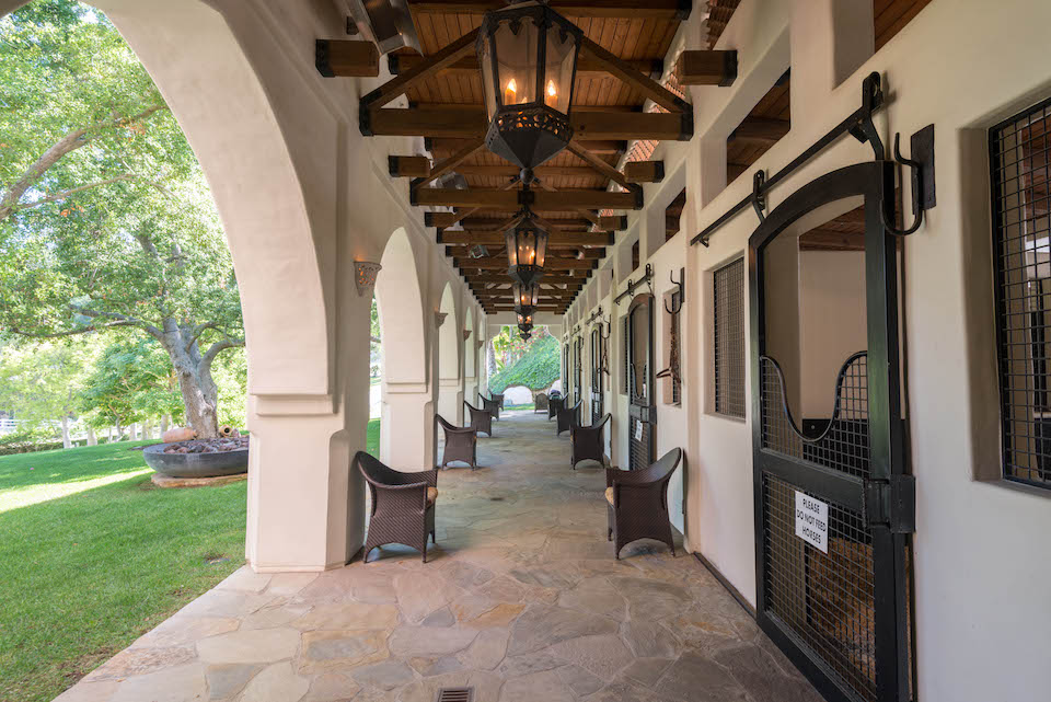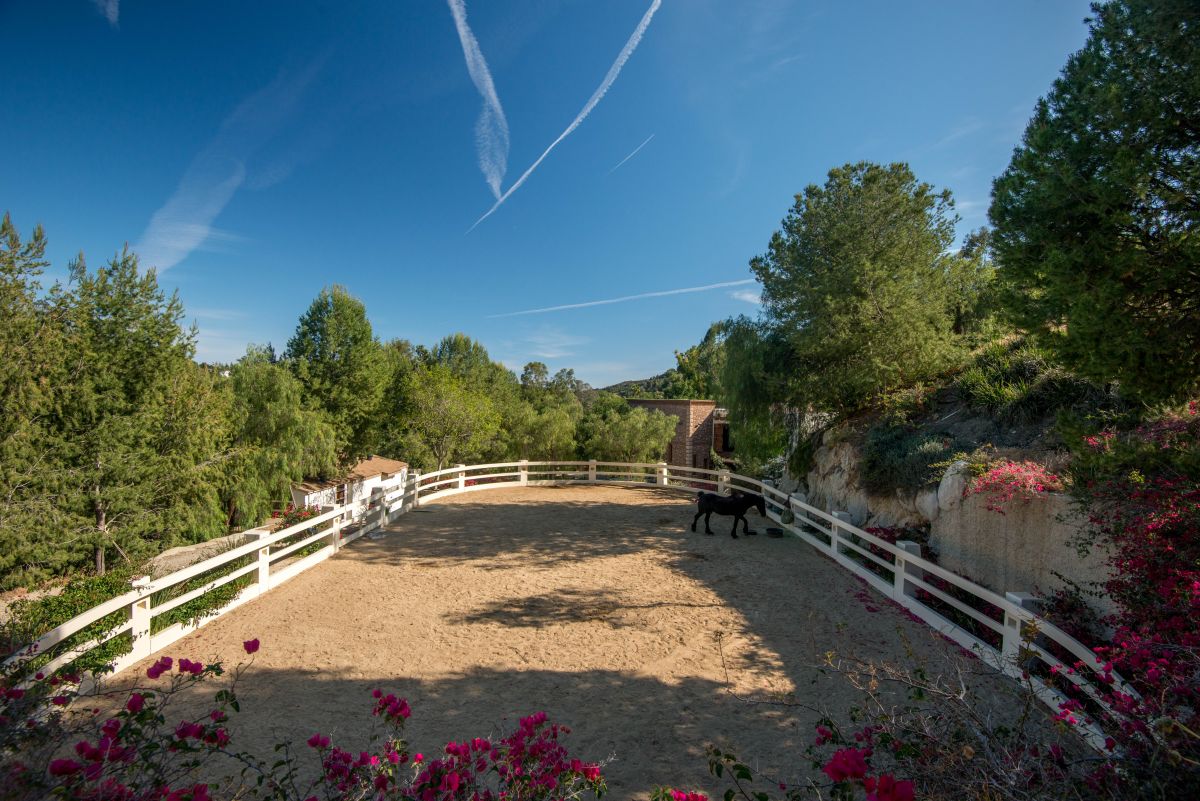 Expansive and fenced in, this 16-acre-property houses a 20,000-square-foot main house, a 7,000-square-foot guesthouse, an equestrian barn, five stables, a couple of horse rings, a swimming pool, and a tennis court.