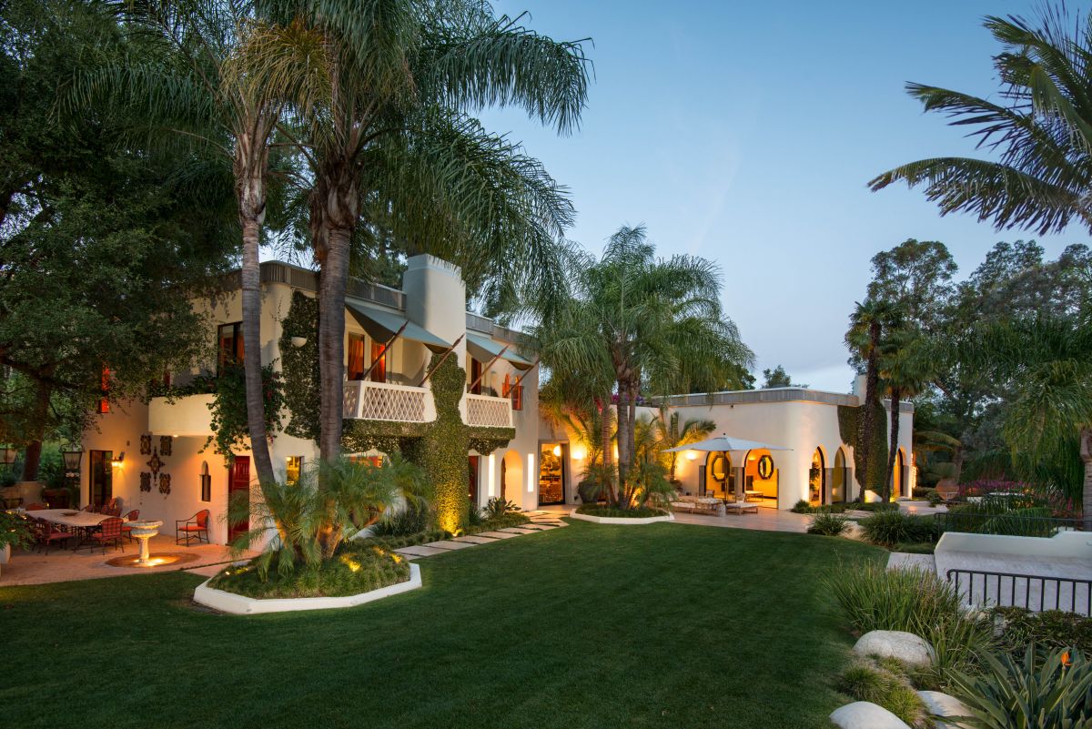 The four-bedroom, two-kitchen guesthouse––which at one time had been used as a main residence, as a result of the actual main house having been under renovation––has six bathrooms, a dining room, and a spa with a Jacuzzi, as well as two fireplaces, a dry sauna, and a patio with views of the lawns.