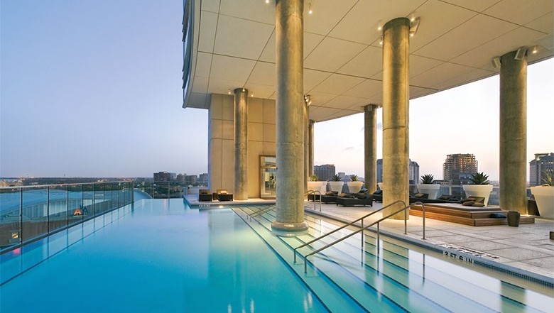 Offering stunning panoramic views, lounge poolside at Victory Park Hotel’s WET infinity pool at the W Dallas on the 16th floor