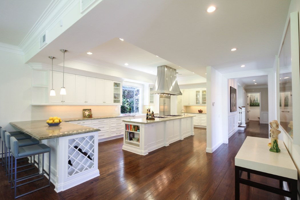 Moving through the house, the pristine kitchen features updated, state-of-the-art appliances, including Sub Zero & Wolf ranges and ovens, a U-Line wine Cabinet, a Bosch warming drawer, a Fisher and Paykel dishwasher and a spacious center island with plenty of room for cooking. Custom cabinetry is featured throughout the space, along with marble counters and floors. The house also features a top of the line sound tech with a built-in audio system, surround sound and iPod docking station.