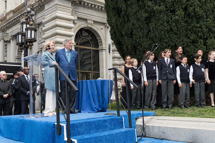 To commemorate Bennett’s 90th birthday—which took place on August 3—San Francisco honored the singer by unveiling a statue in his liking in front of the Fairmont Hotel. Sculptor Bruce Wolf created the 8-foot statue out of bronze. Mayor Ed Lee declared August 19th Tony Bennett day. Charlotte Mailliard Shultz, the city’s chief of protocol, spoke at the ceremony thanking Bennett for his never ending support. “When we brought back the cable cars, he was here. When we wanted to tell people that, after the earthquake, we didn’t fall into the ocean, he was here,” Mailliard Shultz said. Other notable figures who showed up to support Bennett included Pam and Larry Baer, Nancy Pelosi, Dianne Feinstein, Richard Bloom, and Willie Brown, who called Bennett San Francisco’s “adopted son.”