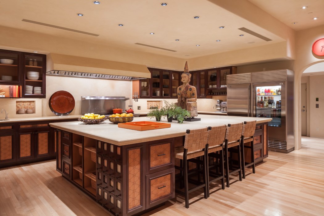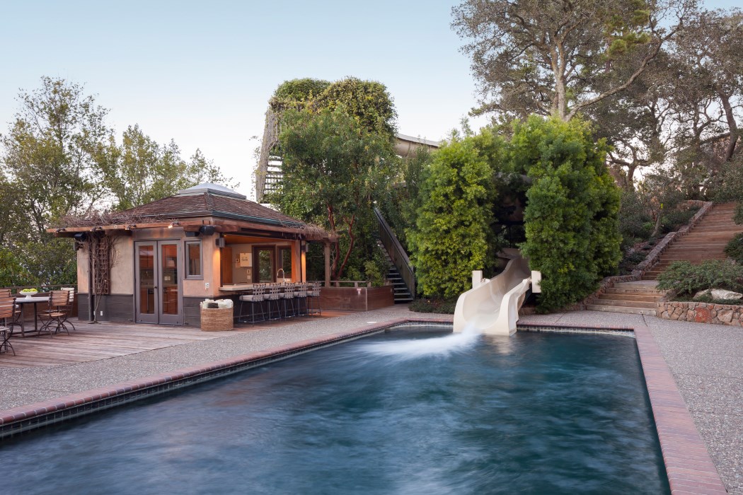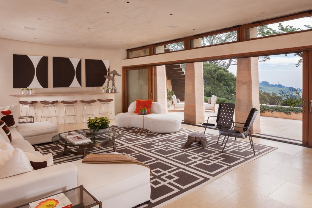 Befitting this estate built with utmost respect for the environment, the grounds are equally sustainable and fully organic with native California landscaping and towering eucalyptus trees. Commercial-quality fruit and vegetable gardens create a farmer’s market milieu, a sun-swept pool, spa, and sport court provide endless hours of fitness and recreation, and strolling paths wind in endless succession for taking in the property’s beauty and enjoying its iconic views.