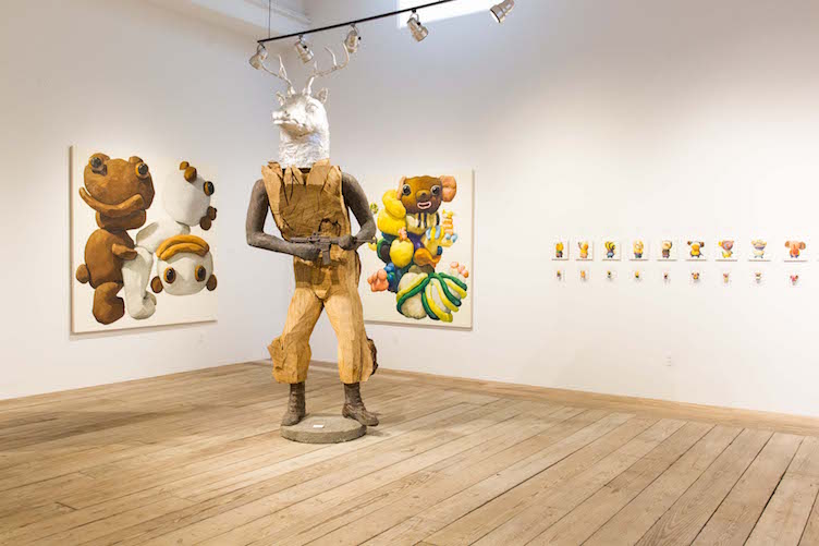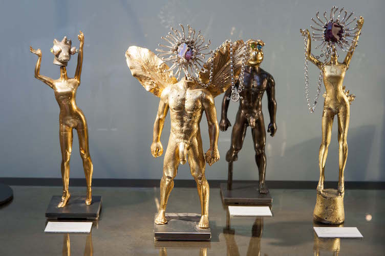 Sculptor Harry Siter made four larger than life bronze and wood statues. His series was about animals fighting back against humans and featured animal heads on human bodies. For example, a cartoon fox head was placed on top of a metallic female body and a silver deer head sat on top of a wooden body with cast iron hands. He also created a series of sensational bobble heads. About a foot tall, each golden statue has a removable head that can be placed on another body. Other pieces have a gemstone and metal flower for heads and these can be removed and worn as jewelry. The other artist was painter Peter Opheim whose work features modern potato head-like creatures that look as if they were made from play dough.