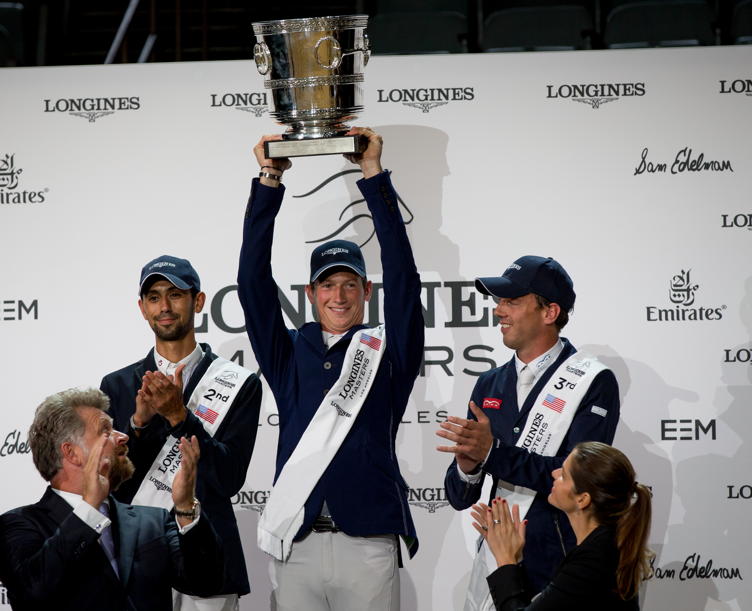 Daniel Deusser holds up the winning trophy at the Longines Grand Prix