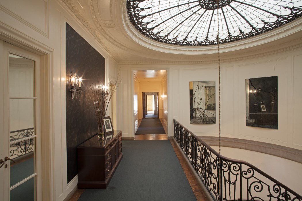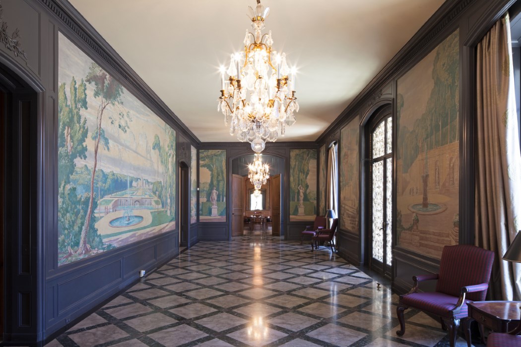 Situated on “Millionaires Row” along tree-lined Orange Grove Boulevard and Madeline Drive is one of the largest and most significant architectural treasures in the prestigious community of Pasadena, California. Surrounded by brick walls, wrought iron gates and matured trees, the John S. Cravens Estate was built in the late 1920s at a reported cost of $1.25 Million. Using only the finest materials and world-renowned designers, artisans and workers, the Cravens Estate boasts approximately 20,000 sq. ft. of living space and was constructed of steel reinforced concrete, brick veneer, imported European finishes, hand painted murals and a Vermont slate roof. It was famous for being the most expensive home ever built in Pasadena, according to a Los Angeles Times story dated February 6, 1955. The architect was San Francisco-based Lewis P. Hobart who designed the iconic Grace Cathedral in San Francisco and was best known for private estates in Northern California. The Cravens Estate was his only known commission in Southern California. The builder was the P.J. Walker Company, the builder of the historic Doheny Greystone Mansion in Beverly Hills. The Greystone Mansion and Cravens Estate are reported to have been their only residential commissions in Southern California. Their other architecturally significant projects in Southern California included the Los Angeles Times Building and the Bullock’s Wilshire in Los Angeles, and the Biltmore Hotel in Santa Barbara. Few builders had a greater impact on the region than P.J. Walker. The Cravens Estate was honored with the Pasadena Beautiful Foundation Award in 1965 and designated as a Cultural Heritage Landmark by the City of Pasadena in 1971. In 2010, it was honored as the Pasadena Showcase House of Design and underwent partial restoration and renovation by many talented and well-known local designers.