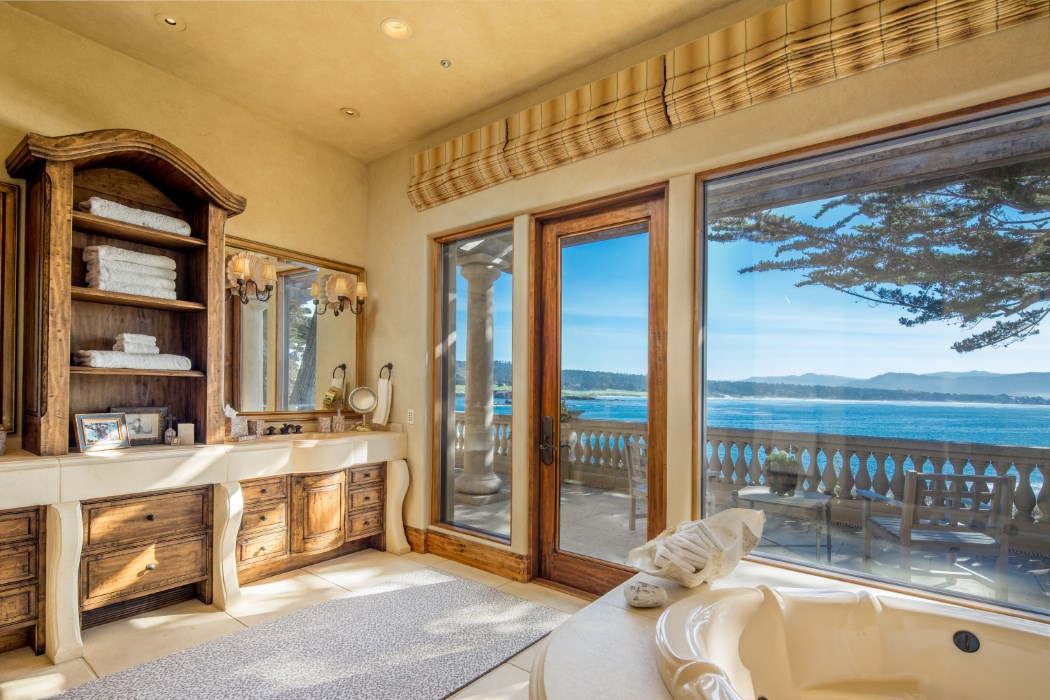 Privately situated on Pescadero Point and a short stroll to The Lodge, this landmark home is one of 31 rarely available waterfront properties in Pebble. This iconic Pebble Beach ocean front estate offers stunning views from every room of the Pebble Beach Golf Links, Carmel Bay and Beach, Carmel Valley, and Point Lobos. Offering four ocean view suites, including an expansive master suite with sitting room/office, and a detached guest house. The gracious residence is bathed in natural light and also offers vaulted ceilings, open floorplan with spectacular kitchen, living and dining areas, and ideal indoor-outdoor living and entertaining with a grand informal great room leading out to an ocean side terrace, with kitchen and infinity swimming pool.