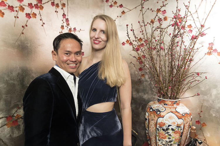 Last night San Francisco’s most sought-after interior designers gathered with the city’s socialites to celebrate the opening of a luxe new wallpaper shop. De Gournay, the creme de la creme of wallpaper and bespoke furnishings, has finally come to the west coast! Their showroom, a sensational jewel-box boutique on Sacramento Street, is now open. It’s a series of rooms each covered in a different hand-painted wallpaper, in vibrant prints like chinoiserie and exotic designs inspired by foreign lands. Flora and fauna play a part in many motifs—one features buffalo dashing across a meadow, another has elegant flamingos lounging in a pond. Peacocks, cherry blossoms, wisteria, toucans, and koi fish appear on de Gournay’s beautiful wallpapers. Texture is added to the paper with various types of silk and velvet, all hand sewn by a team of artisanal craftspeople. Panels of the brand’s various wallpapers hang from the ceiling at the back of the showroom, but of course, if you want something custom that can be arranged, too. There is a gorgeous back patio that will most likely be a perfect place for many upcoming haute events. The bathroom is covered in a gilded black and gold paper, making it one of the sexiest powder rooms in the city.
