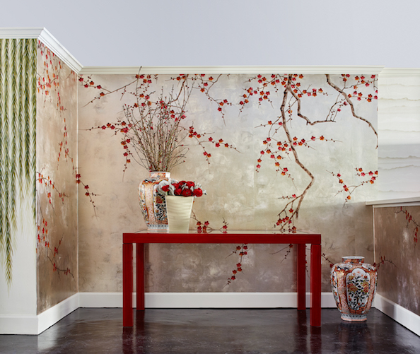 Another focal point of the affair? The stunning florals, arranged by none other than Jonathan Rachman. Before he was the design guru he is now, Rachman created otherworldly arrangements for the likes of Marc Jacobs. His flowers matched the wallpaper in each room. A wild array of orange parrot tulips, two-toned green-and-yellow ranunculus, and pink peonies mirrored the palm frond-and-butterfly print found in the foray. Blood red ranunculus and silver sage leaves matched the cherry blossom metallic wallpaper that served as a backdrop for the bites. Besides Rachman other notable designers who attended the event included Claudia Juestel, Kendall Wilkinson, Maja Smith, and Jeffrey Alan Marks. Other fabulous guests: Trevor Traina, Alison Pincus (wearing the most chic Gucci booties), Anne Sophie Deneve, Kate Harbin, and Allison Speer. Rumor has it that de Gournay will soon grace the walls of a certain white house in Washington—it will definitely find its way into the most stylish of Bay Area homes. From velvet throw pillows and hand-painted porcelain phoenix statues to gilded mirrors and Art Deco-inspired chandeliers, everywhere you looked there was decadent opulence. The arrival of de Gournay officially proves that more is more and old-world glamour is back!—and possibly here to stay? We hope so.