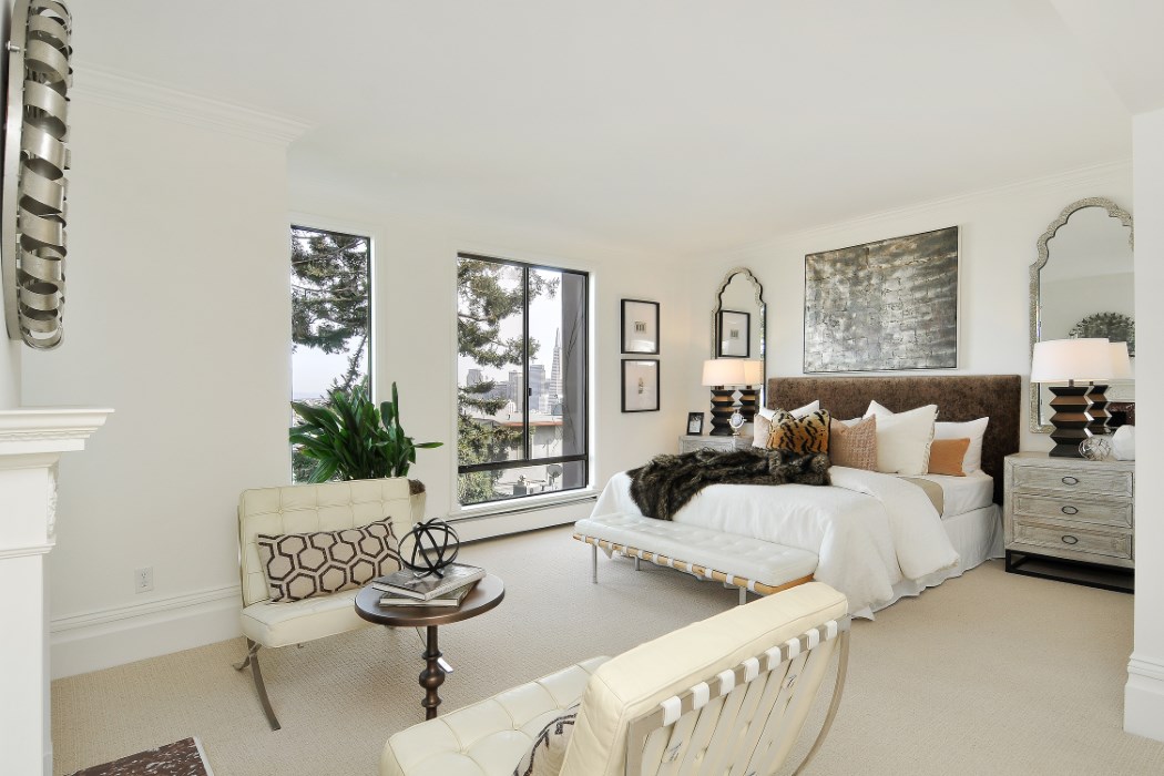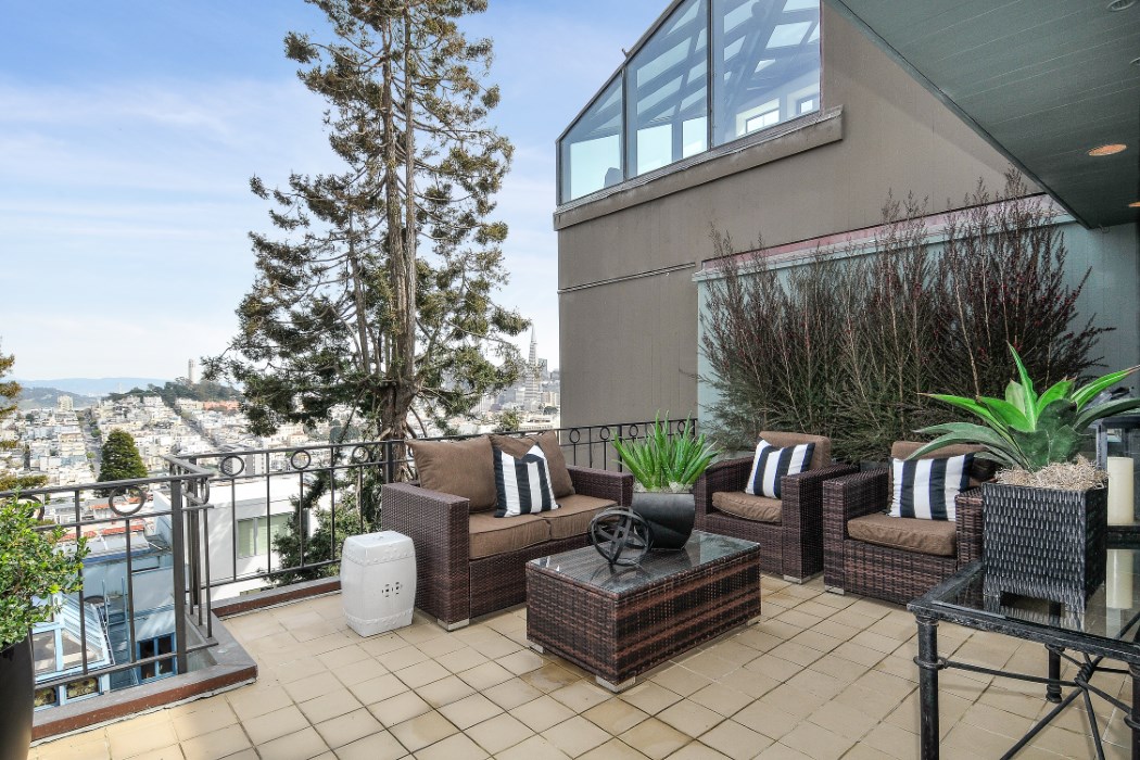 Spacious light-filled view townhouse condominium in Russian Hill. Three levels of luxurious living with beautiful views of the East Bay, the Bay Bridge, the City, Telegraph Hill, Coit Tower, the Financial District, the Transamerica Pyramid, and Alcatraz.
