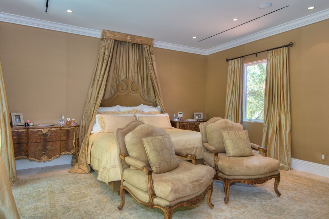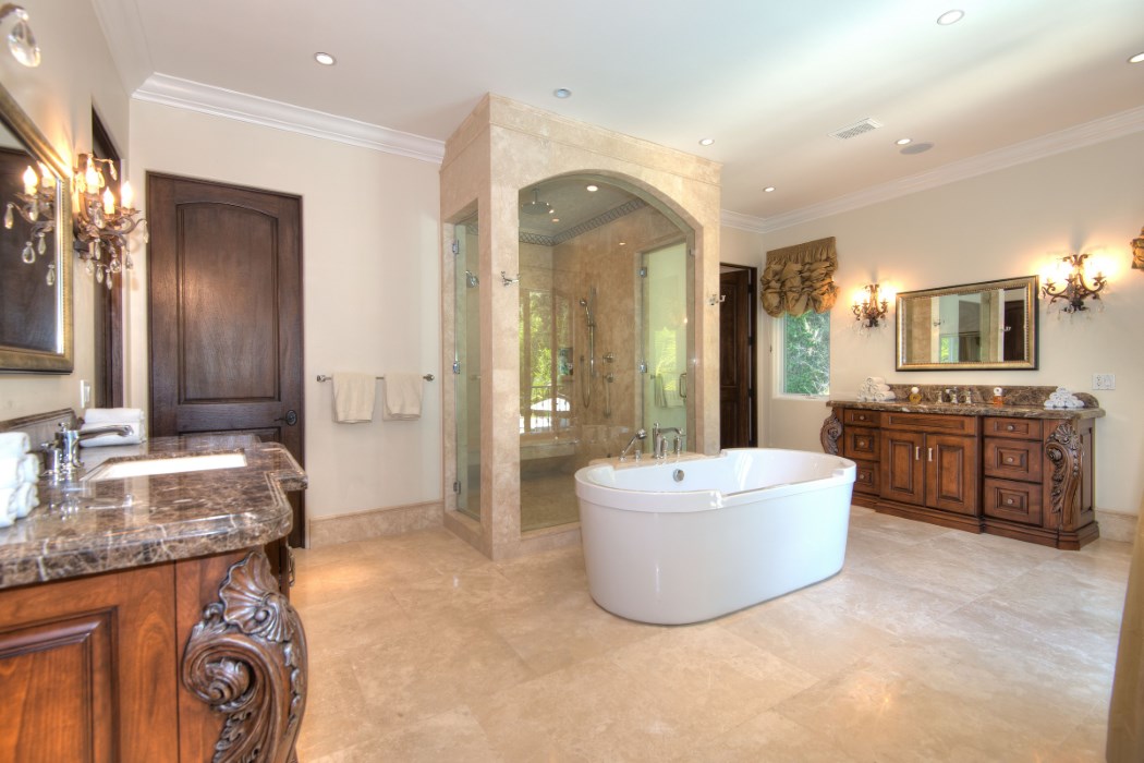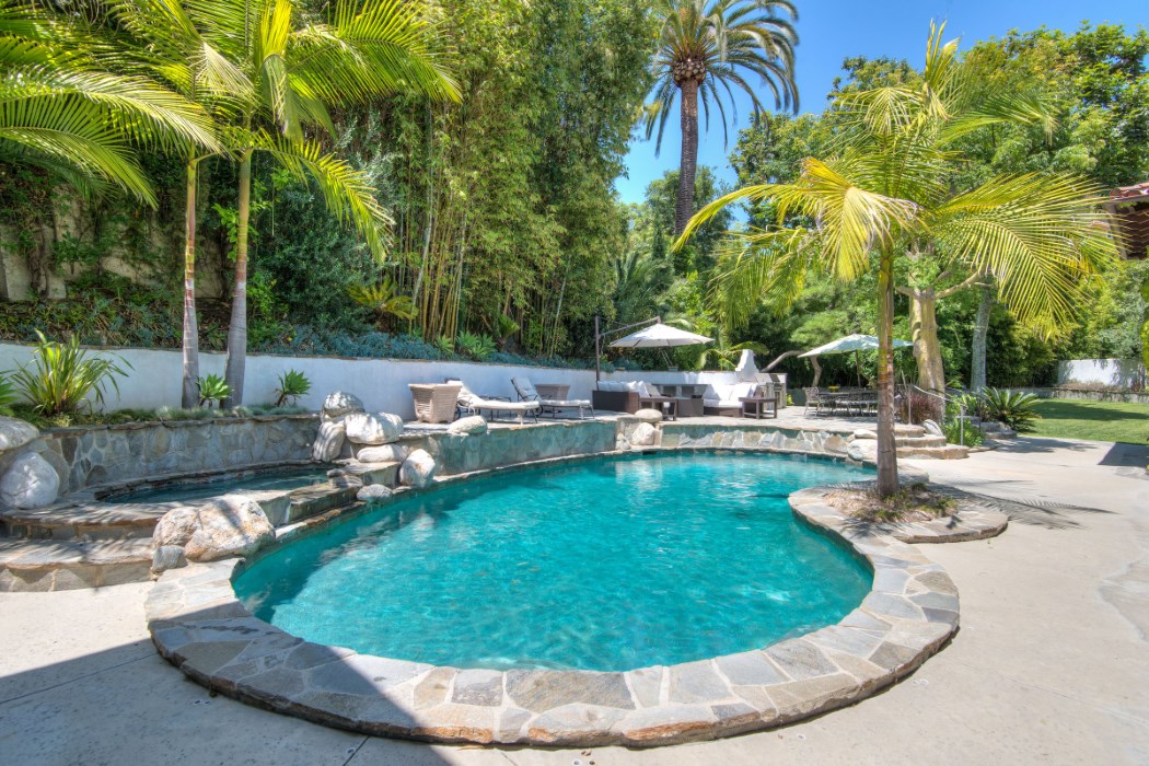 Located at end of a serene cul-de-sac, this majestic home has been completely rebuilt in 2010 by current owners. An entertainers showplace features limestone floors, soaring Venetian plaster ceilings/walls, and french doors letting in light from gorgeous private yard. Sunny pool/spa area, complete with barbecue center, perfect for outdoor entertaining. Four ensuite bedrooms located downstairs, all with luxurious limestone baths. Private upstairs master suite with separate office, fireplace, balcony, grand bath and huge closets. Additional en-suite bedroom upstairs. Theater, guest suite and 3-car garage.