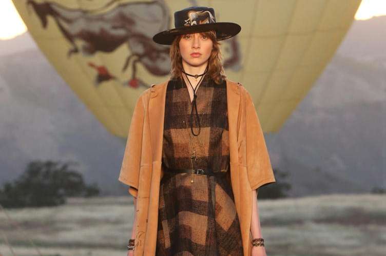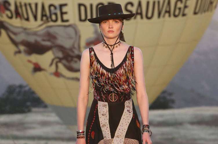 It is this wild and ancient femininity, linked to the magic of the earth, that guided Chiuri here. A feminine representation takes shape with her collection, bringing into the present this shamanic intuition, a wild and almost bestial spirit of which Clarissa Pinkola Estés writes in one of the designer’s favorite books: “Women Who Run with the Wolves.”  With her vision, prehistoric wolves emerge from the Lascaux cave to take their place on silk jacquards where the ocher, almost gold in color, contrasts with blacks. Female handprints, reinterpretations of the original forms, become sequined embroideries in earthy shades Chiuri has also brought a pop interpretation to her use of the tarots given a high-octane feminist reinvention by Vicki Noble in order to give new life to Dior’s beloved art of divination. The idea that a person’s smell is the expression of their soul can be found in the feminine take on an emblematic perfume such as Eau Sauvage. The intangible imprint of this wild, erratic figure restores woman once again to her place at the center of the world.