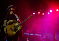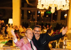 Michael Franti high fives Mike Maples at the gala on Saturday night